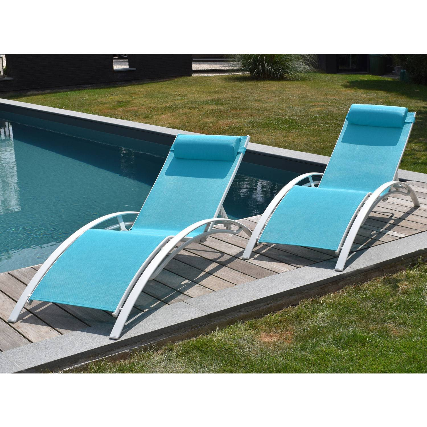 Sur votre terrasse ou autour de la piscine, le lot de deux bains de soleil en textilène GALAPAGOS fera de l'effet ! Ces transats donneront une touche d'originalité à votre extérieur avec leur bleu ciel pétillant et leur structure tout en rondeur.Le textilène qui compose l'assise des bains de soleil est une matière qui offre un confort surprenant car il épouse parfaitement la forme du corps. Sa toile est composée de petites alvéoles qui permettront à votre peau de respirer même pendant les grosses chaleurs.Choisissez votre position idéale grâce au dossier inclinable sur plusieurs niveaux. Quelques soient vos envies - sieste, relaxation ou lecture - vous serez très bien installé, davantage encore avec son appui-tête moelleux.Relaxez-vous en duo et faites de ce lot de bains de soleil votre mobilier farniente de prédilection pour tout l'été.