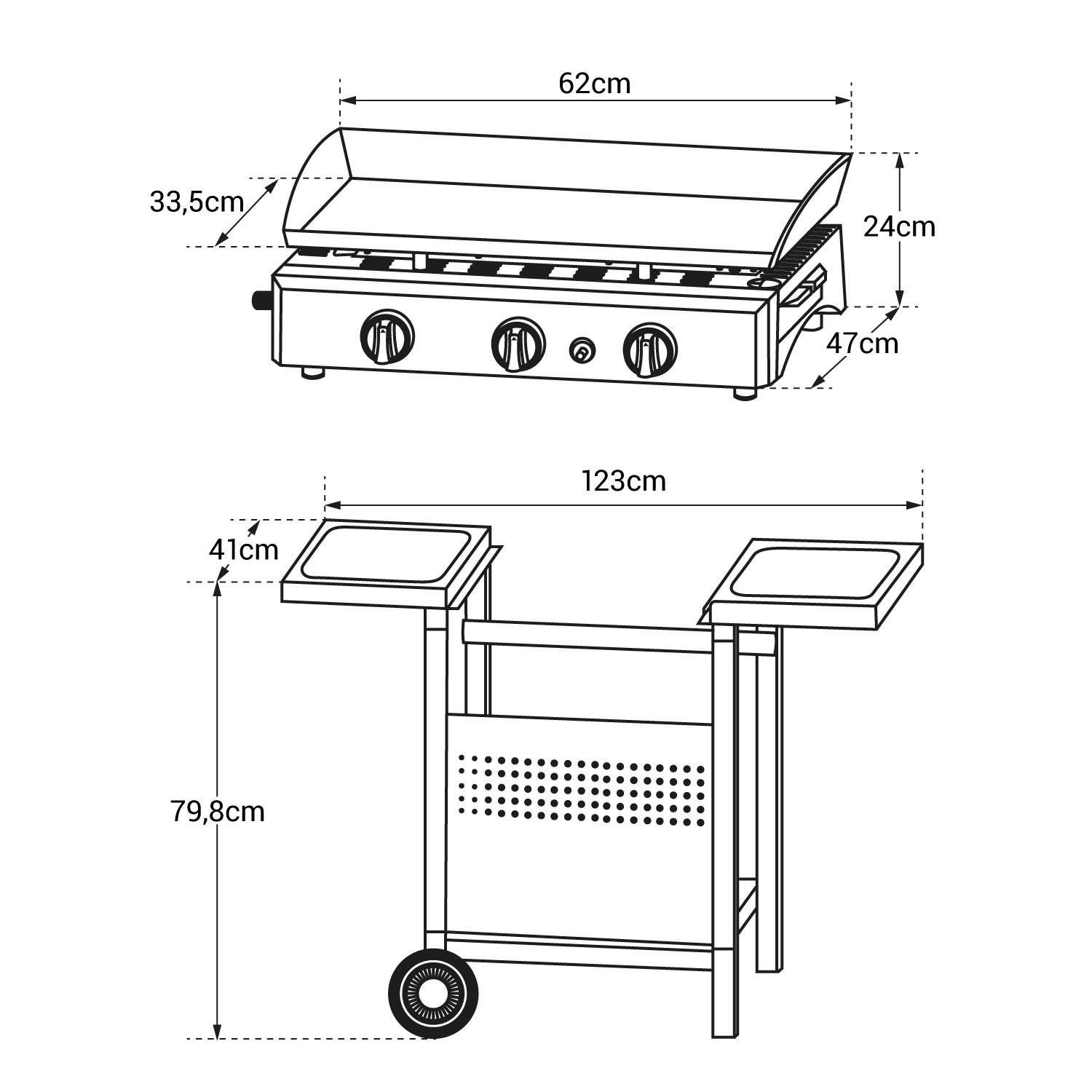 La plancha au gaz offre une rapidité de cuisson inégalée. Ses 3 brûleurs vous permettront de cuire de façon homogène et saine pour environ 10 personnes. Son chariot à roulettes rendent cette plancha facile à déplacer. Vous pouvez également retirer la plancha de son chariot pour la mettre au milieu de votre table afin que vos convives puissent directement se servir.