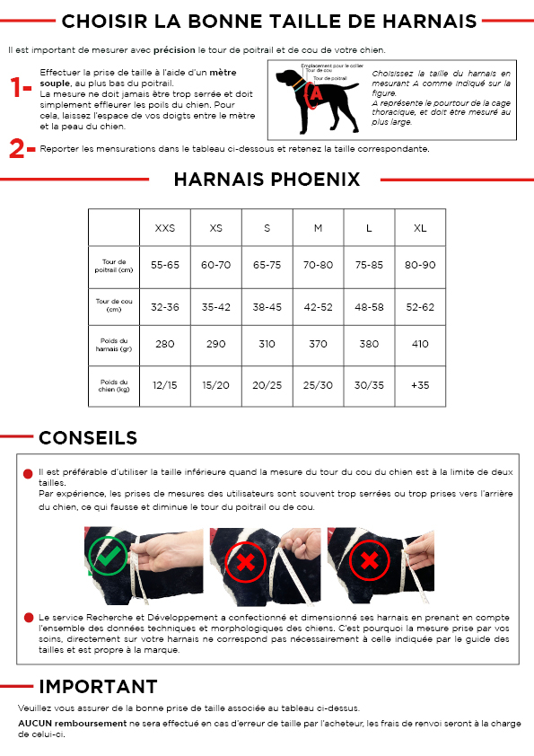 | Plus produit | Harnais PHOENIX de la gamme ALM destiné à la forte traction ainsi qu’à la compétition. Entièrement réglable, type X-Back il convient à la majorité des chiens, épouse parfaitement sa morphologie (6 tailles disponibles). |