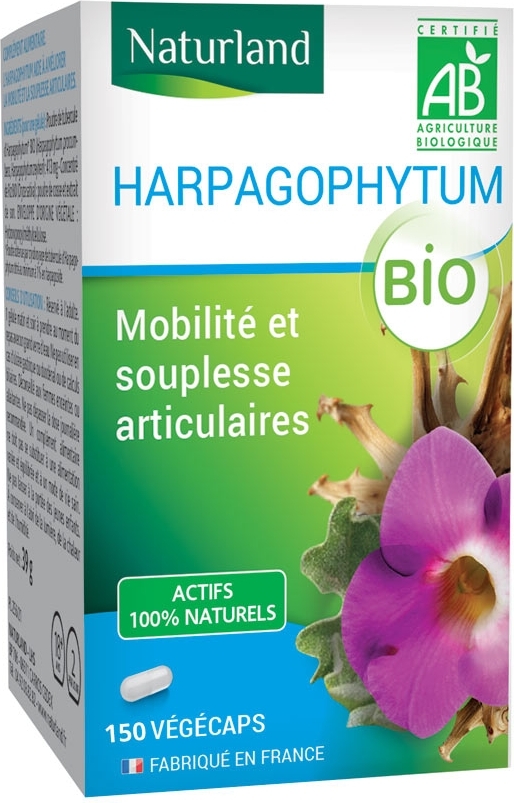 Naturland Harpagophytum Bio 150 Végécaps est un complément alimentaire certifié biologique, à base d'Harpagophytym pour aider à favoriser la mobilité et la souplesse des articulations. Dans une gélule, retrouvez la totalité des actifs naturels de la plante (le Totum).