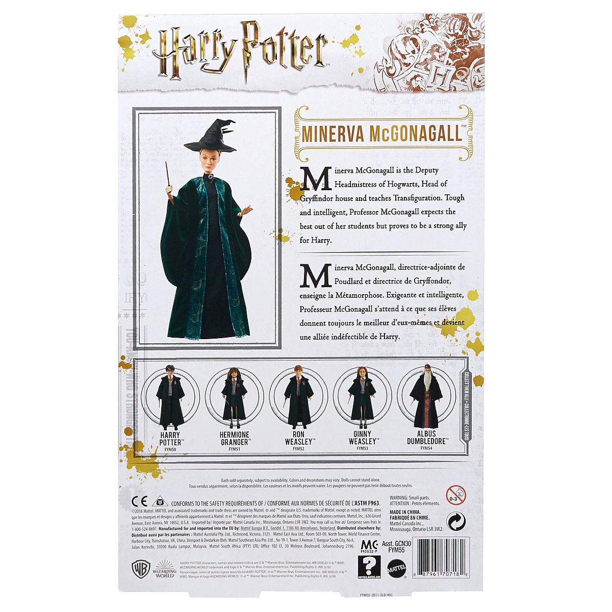 Plus produit Les fans et les collectionneurs adoreront rejouer leurs passages préférés et imaginer leurs propres scénarios ! § Des détails spécifiques, tels que sa robe et son chapeau, font de la poupée Professeur McGonagall une fidèle reproduction du personnage de la célèbre saga Harry Potter. § La poupée porte les vêtements des professeurs de Poudlard et une baguette que les fans peuvent utiliser pour aider la sorcière aguerrie à lancer des sortilèges et des maléfices. § Les onze « articulations » de la poupée offrent d\'infinies possibilités de positions pour imaginer des scénarios enflammés dans lesquels le Professeur McGonagall aide Harry à vaincre Lord Voldemort.  § Harry Potter : jamais sans ses amis ! Les jeunes fans peuvent collectionner leurs personnages préférés pour s\'amuser encore plus et multiplier les possibilités de jeu.