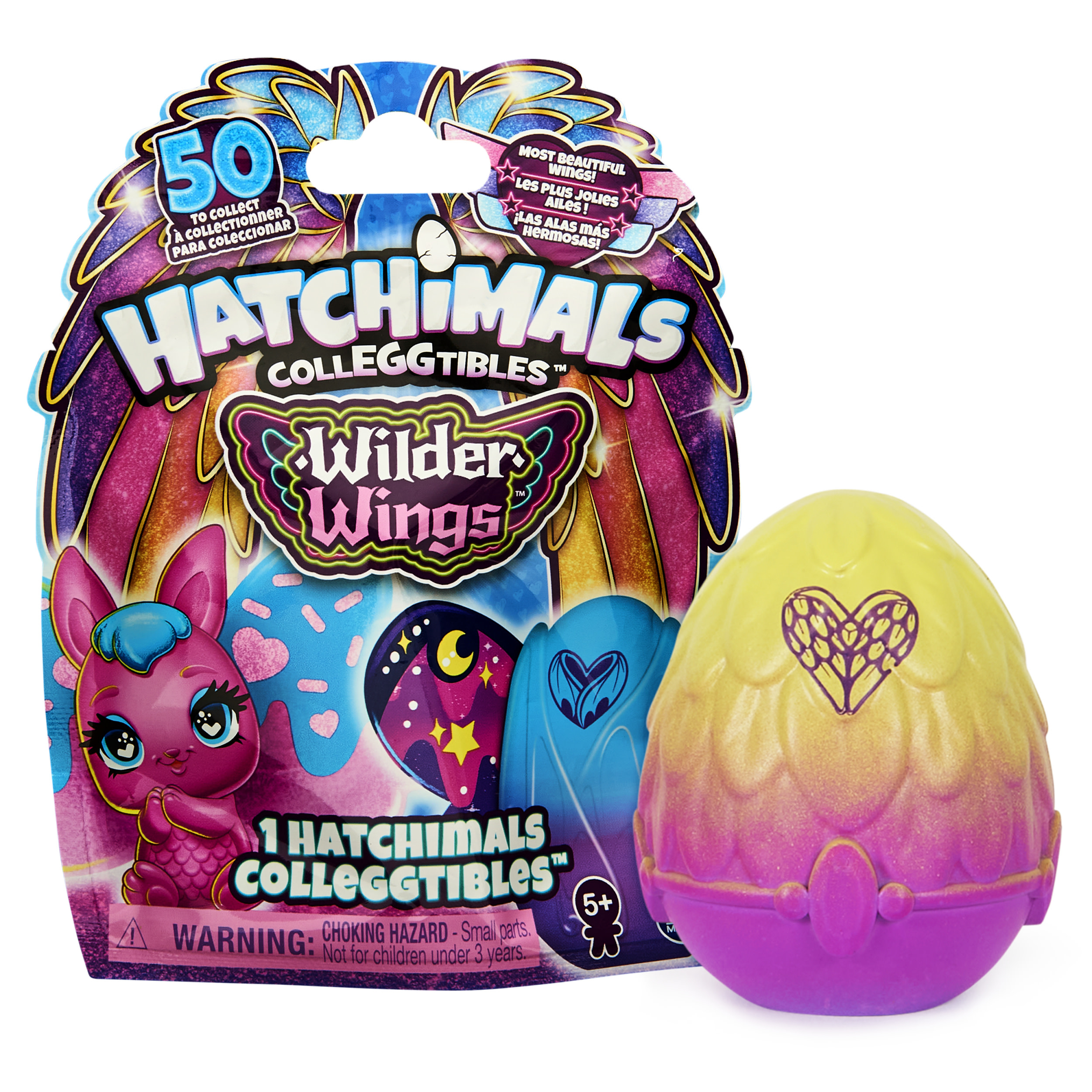 Découvre l'un des Hatchimals CollEGGtibles WILDER WINGS les plus fantastiques avec ce pack. La tempête de paillettes a déferlé sur Hatchtopia, transformant les ailes des Hatchimals et des Pixies en Wilder Wings. Ces adorables personnages Hatchimals sont dotés des plus jolies ailes géantes pouvant toutes se combiner. Il existe plus de 10 styles de Wilder Wings comme par exemple ange, fleur, chauve-souris, nuage, dépareillées et bien d'autres. Il y a encore plus de surprises à découvrir : une nouvelle éclosion sauvage et neuf options d'ailes différentes telles que souples, paillettes, imprimées et bien plus encore. À l'intérieur du coffret fantaisie, tu trouveras 1 Hatchimals dans son oeuf ainsi qu'une magnifique paire de Wilder Wings. Chaque nouvel œuf est doté d'un design inspiré des ailes et les Wilder Wings se trouvent à l'extérieur des œufs. Craque l'avant de l'un des œufs pour révéler ton nouvel ami. Ensuite, fixe facilement ses ailes. Fais éclore le reste des œufs et rencontre ta nouvelle bande d'amis fantastiques. Fais éclore Draggle avec ses ailes de chauve-souris toutes douces ; Unikeet avec ses ailes souples à fleurs ; Tigrette avec des ailes scintillantes en forme de flèche ; Penguala avec ses ailes dépareillées de chauve-souris et d'ange, et bien d'autres personnages. Trouveras-tu le Pandor super découverte (1 chance sur 100) avec des ailes en tissu arc-en-ciel ? Combine les ailes sur tous tes Wilder Wings Hatchimals pour imaginer de nouvelles créations amusantes. Avec 50 Wilder Wings Hatchimals et 6 Wilder Wings Pixies à collectionner, ajoute-les tous à ta collection (chacun vendu séparément). Sur ta fiche de collection, tu trouveras aussi un code Hatchtopia Life à utiliser dans l'application gratuite (compatible avec les appareils iOS et Android). Fais éclore des ailes extraordinaires avec le coffret fantaisie Hatchimals CollEGGtibles.