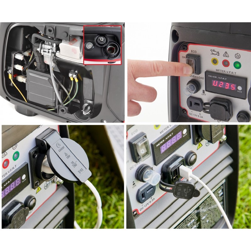 L'onduleur HECHT est alimenté par un puissant moteur 4 temps d'une cylindrée de 79,8 cm3. Le démarreur à traction souple assure un démarrage fiable. Grâce au réservoir de carburant de 4 litres, une autonomie de 6 heures est assurée. Grâce à la jauge de carburant pratique, vous avez toujours un œil sur le niveau de remplissage du réservoir et savez quand faire le plein. Grâce au boîtier en plastique insonorisé, l'onduleur est plus silencieux que les groupes électrogènes conventionnels.