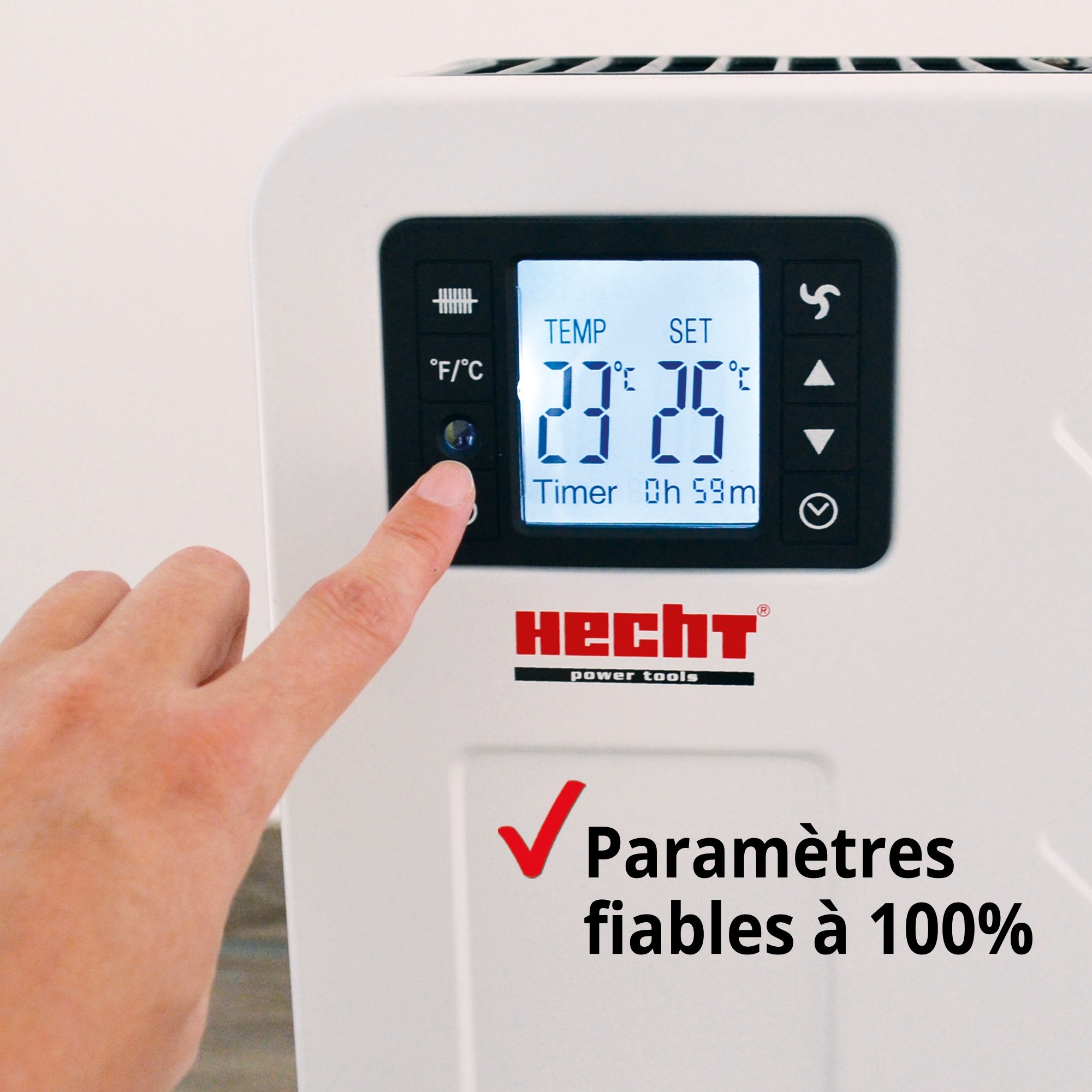 - TEMPÉRATURE CONSTANTE Ce radiateur électrique mobile de Hecht assure une chaleur rapide et confortable. Dans peu de tempsé des pièces d’environ 15 à 20 m2 seront chauffées. L'appareil de chauffage électrique à haute vitesse (appareil de chauffage électriqueé chauffage d'appointé radiateur avec télécommandeé radiateur pour salle de bain) est doté d'un thermostat pratique.