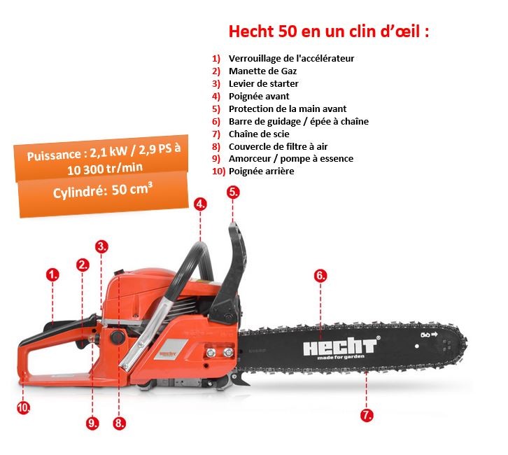 | Libellé | Hecht jardin 50 Scie à chaîne à essence Tronçonneuse à 2 temps 10 300tr/min 2,9ch 50cm3 |