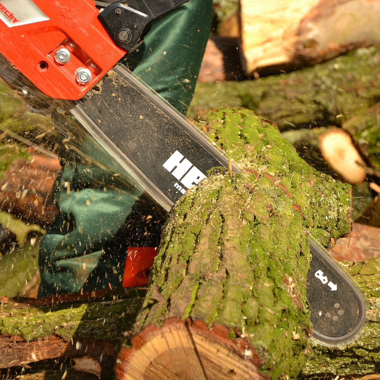 La tronçonneuse est équipée d'une épée de marque Hecht de 40 cm avec une étoile de guidage dans la pointe de l'épée. La longueur de coupe est de 39 cm. La chaîne se compose de 66 maillons d'entraînement de chaîne.