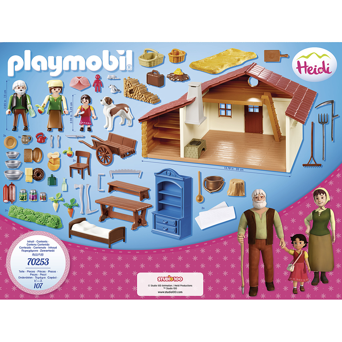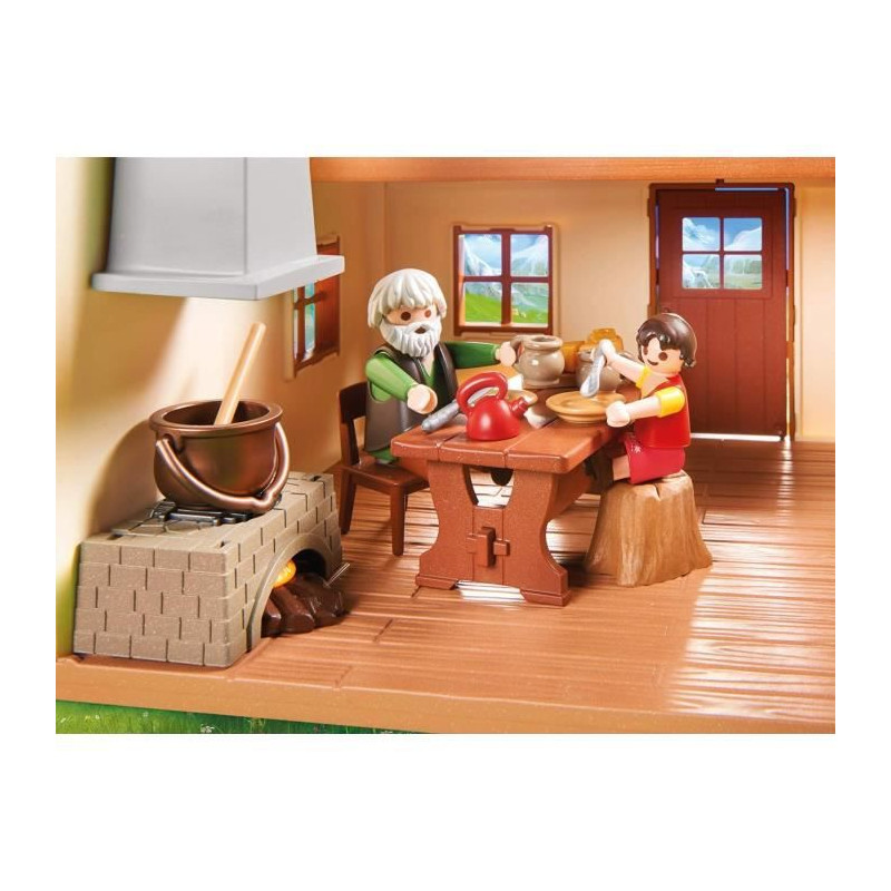 | Plus produit | - Contient les personnages d\'Heidi, de son grand-père et de sa tante\n- La cape d\'Heidi est amovible\n- Avec un support extérieur pour suspendre les outils de la cabane alpine |