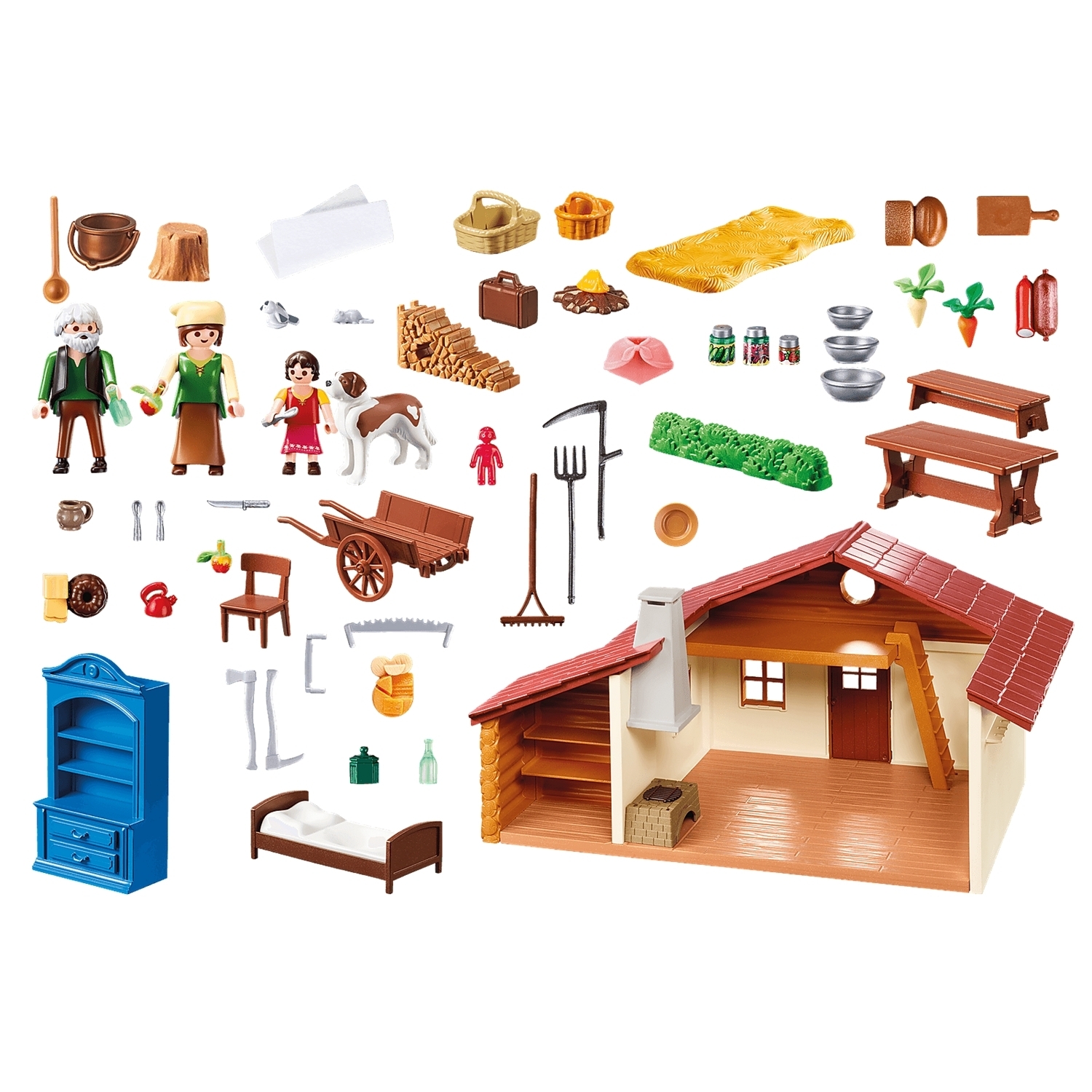 Grand-père coupe du bois, pendant qu'Heidi joue avec le chien dans le jardin. Chalet avec grand espace de vie, espace de stockage pour la paille sous le toit et garde-manger. Comprend trois personnages et le chien Hercule.