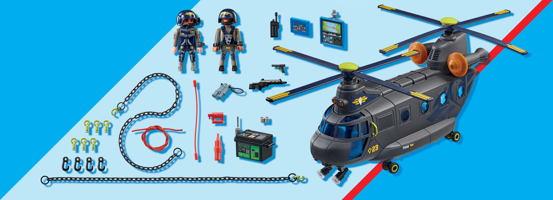 Les forces spéciales de Playmobil arrivent chez Playmobil. Vous pouvez compter sur eux pour relever les défis impossibles et mener à bien les missions les plus incroyables ! Munis de tous leurs équipements de pointe, aucune mission ne peut leur résister. L'hélicoptère des forces spéciales d'interventions a une apparence qui rappelle celle d'une banane. C'est de cette drôle de ressemblance que vient son nom d'hélicoptère "banane". Muni de double hélices, il dispose d'un vaste espace intérieur pour transporter hommes et matériels lors des interventions les plus difficiles à l'autre bout du monde. Véritable forteresse volante, il renferme de nombreux systèmes de protection et instruments pour repousser les criminels. Un système de corde permet aux agents de pouvoir descendre au bout de cette dernière. Les équipements technologiques tel que le robot d'intervention témoignent de la force de frappe de cette brigade surentraînée. Ces deux agents risquent bien de vous surprendre ! Nécessite 2 piles 1,5V type (AAA)