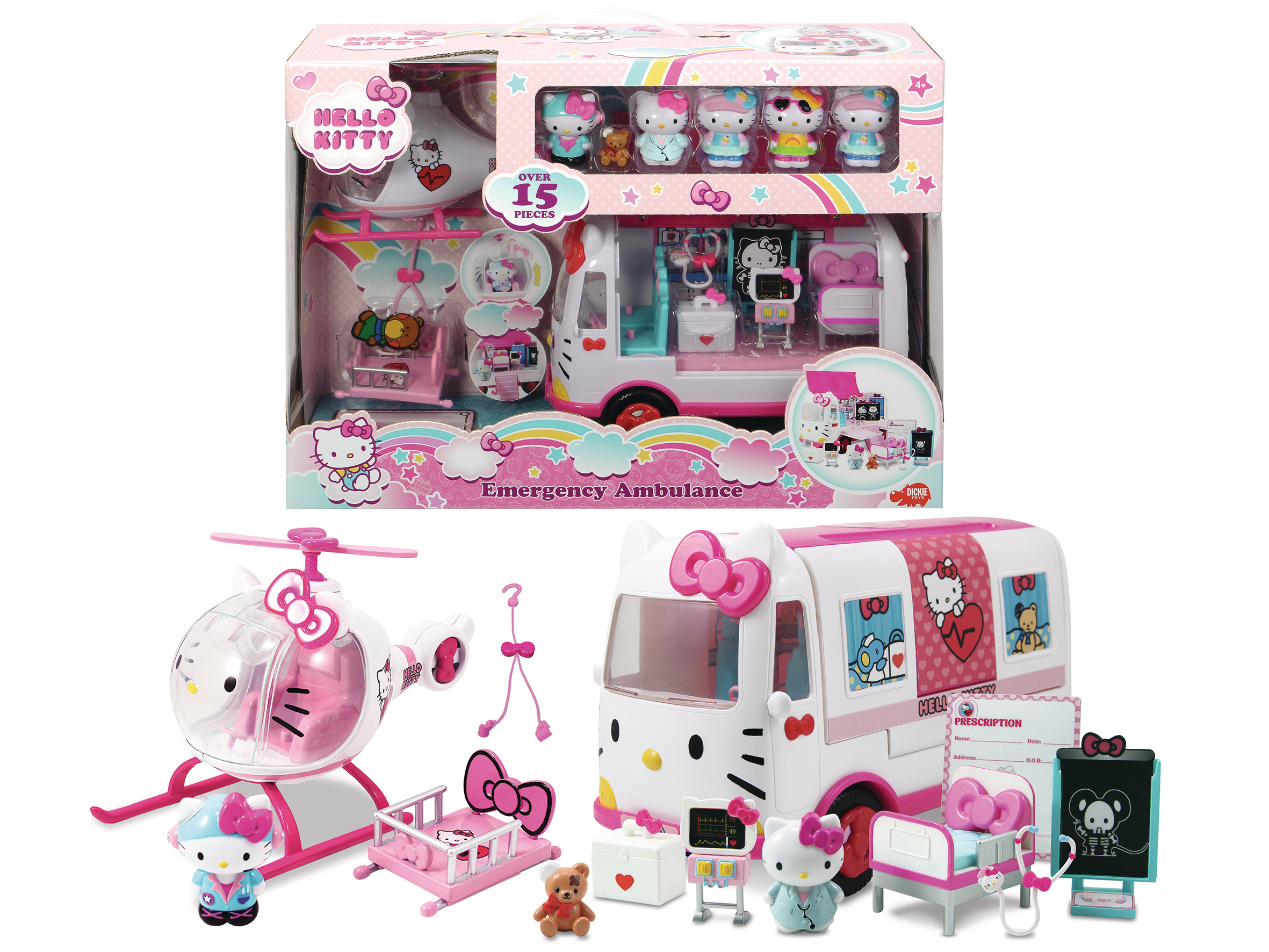 Playset de secours Hello Kitty comprenant plus de 15 pièces dont 1 ambulance, 1 hélicoptère, 6 figurines et de nombreux accessoires (carnet de prescription, radios, stéthoscope, ...). L'ambulance à roue libre se déploie et son toit s'ouvre pour laisser place à une véritable salle d'urgence avec un lit. La porte du cockpit de l'hélicoptère s'ouvre également et le brancard amovible peut être fixé à l'hélicoptère. L'ambulance et le cockpit peuvent accueillir des figurines à leurs commandes. Les figurines non articulées mesurent 5cm, sauf le petit ours. Dimensions de l'ambulance : 34x10x24cm Dimensions de l'hélicoptère : 17x9x11cm A partir de 4 ans.