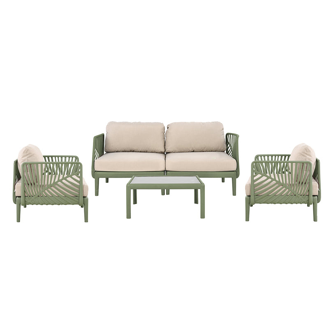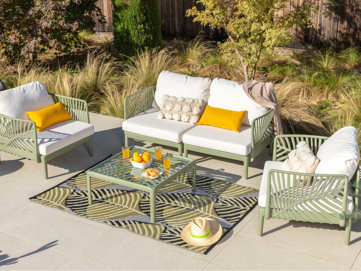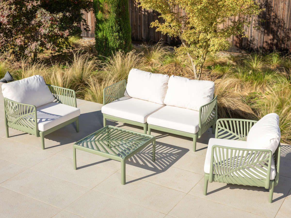 Ensemble salon bas – Résine PP 50% recyclé + coussins – Couleur : Vert sauge – Dimensions : Fauteuil 74 × 83,5 × 77,5 × 42,5 cm, Canapé 2 places 74 × 153 × 77,5 × 42,5 cm, Table 69 × 69 × 32 cm