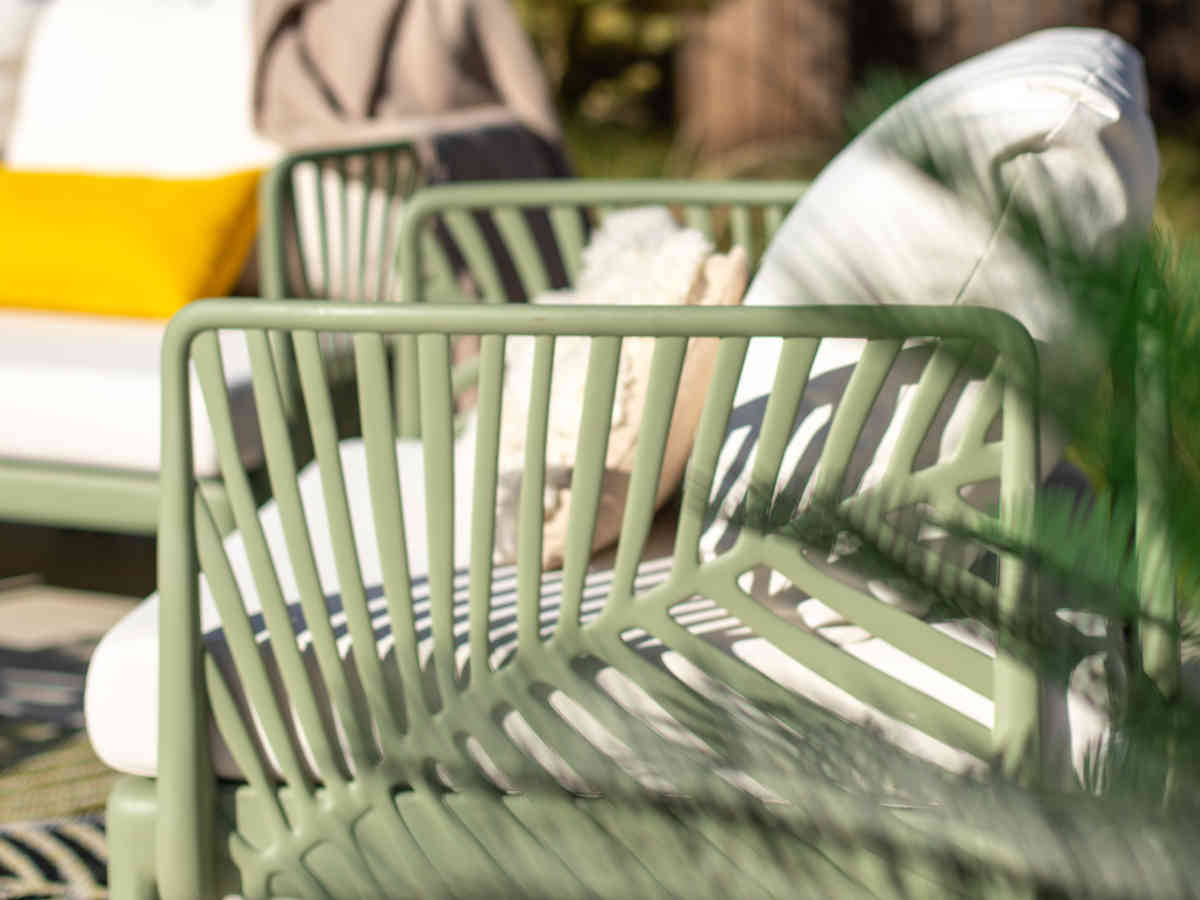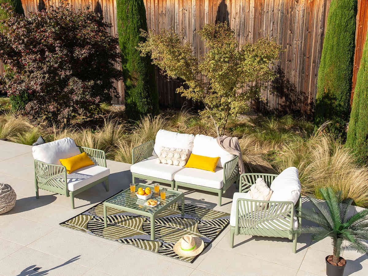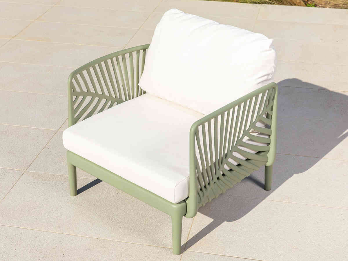 Ensemble salon bas – Résine PP 50% recyclé + coussins – Couleur : Vert sauge – Dimensions : Fauteuil 74 × 83,5 × 77,5 × 42,5 cm, Canapé 2 places 74 × 153 × 77,5 × 42,5 cm, Table 69 × 69 × 32 cm