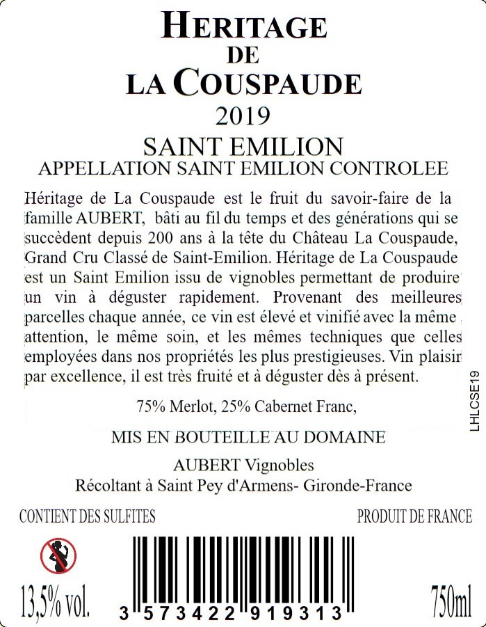 | Libellé | Héritage de la Couspaude, 2019 - Saint-Emilion AOP - Rouge - 75 cl |