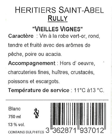 Libellé Héritiers Saint-Abel Vieilles Vignes, 2020 - Rully AOP - Blanc Sec - 75 cl