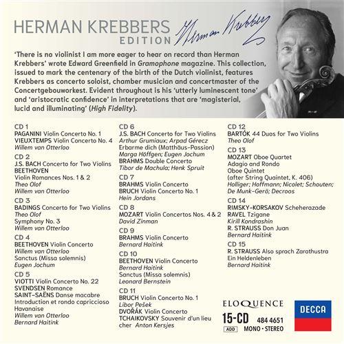La collection la plus complète jamais publiée de l'art de Herman Krebbers (1923-2018) mettant en vedette le grand violoniste néerlandais en tant que soliste, concertiste, musicien de chambre et 1er violon en orchestre pour marquer le centenaire de sa naissance. Une collection originale avec ochettes d'origine d'un musicien très apprécié, avec une présentation de Bernard Haitink, écrite peu avant sa mort.