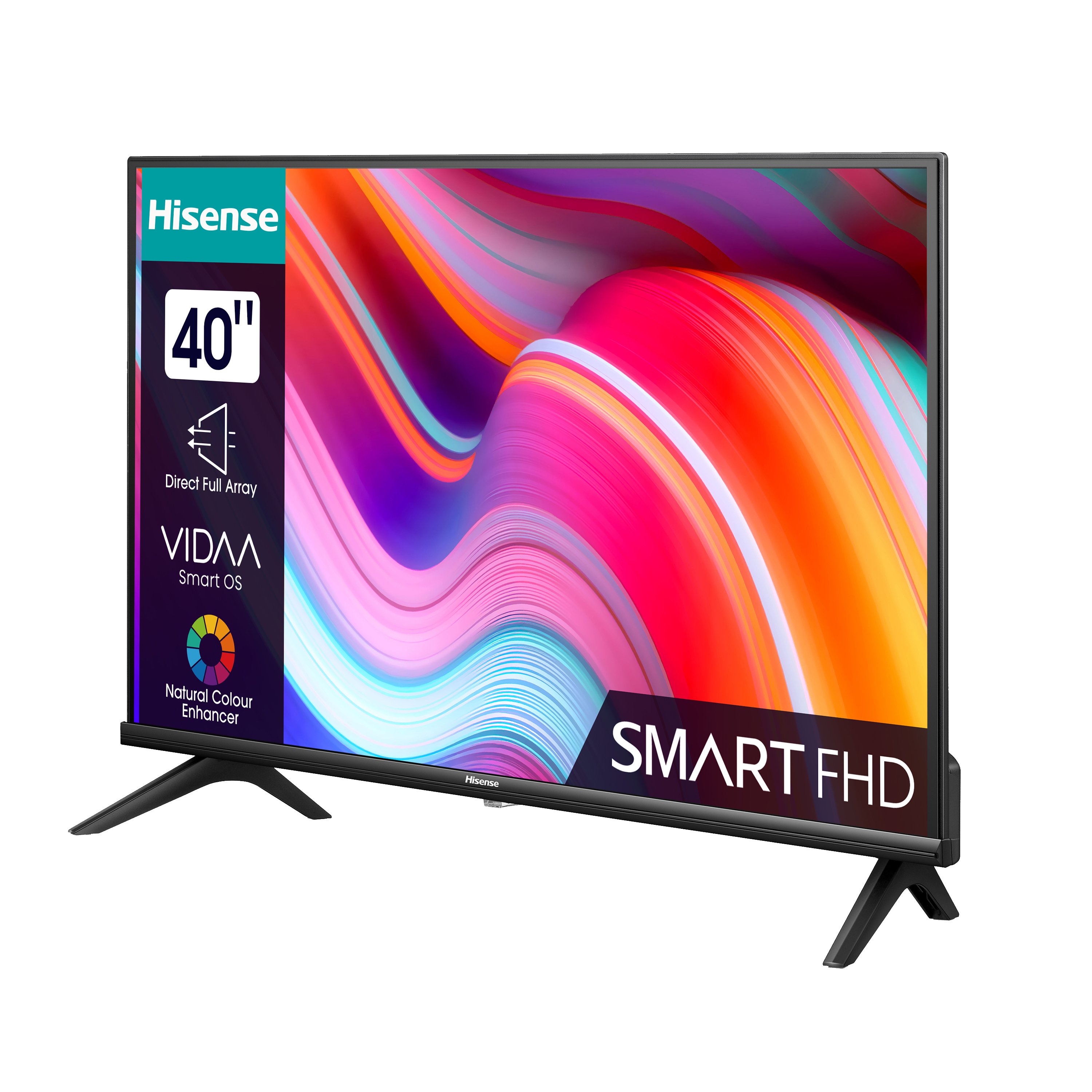 Hisense 40A4K. Taille de l'écran: 101,6 cm (40"), Résolution de l'écran: 1920 x 1080 pixels, Type HD: Full HD, Technologie d'affichage: LED, Forme d'écran: Plat, Rétroéclairage LED: LED directe. Smart TV. Luminosité de l'écran: 200 cd/m², Temps de réponse: 9,5 ms, Taux de contraste: 5000:1, Format d'image: 16:9. Format du système de signal numérique: DVB-C, DVB-S2, DVB-T2. Wifi, Ethernet/LAN. Couleur du produit: Noir