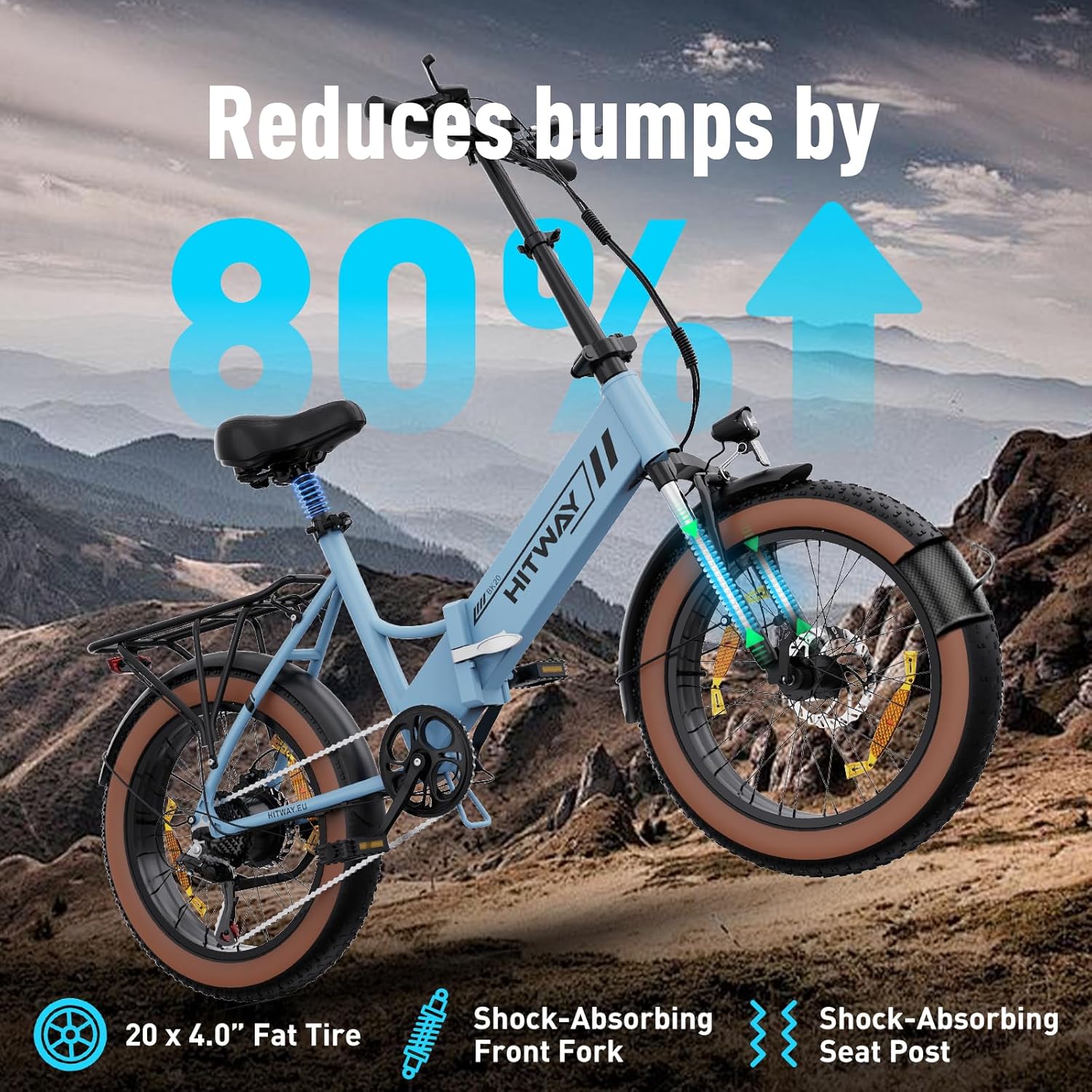 🚴CONDUITE CONFORTABLE : Le vélo électrique HITWAY est équipé de pneus larges de 4,0 pouces, élargissant la largeur des pneus pour augmenter l'adhérence et fournir une absorption supplémentaire des chocs, ainsi que d'un amortisseur de fourche et d'un siège avec amortisseur, ce qui permet de réduire efficacement les vibrations. Il peut s'adapter à la route, à la montagne, à la neige, au sable et à d'autres surfaces, vous apportant une expérience de conduite confortable et libre.