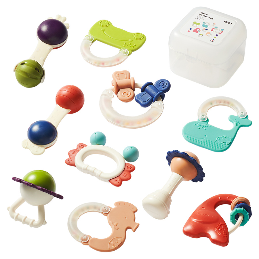Série de hochets pour bébéCet ensemble de hochet a un total de 10 jouets de hochet de différentes formes et couleurs, avec des formes mignonnes telles que des baleines, des hippocampes, des pieuvres, des grenouilles, etc. Il est également livré avec une boîte de rangement en plastique anti-poussière pour un transport et un stockage faciles.