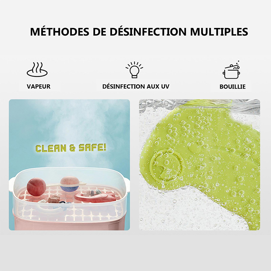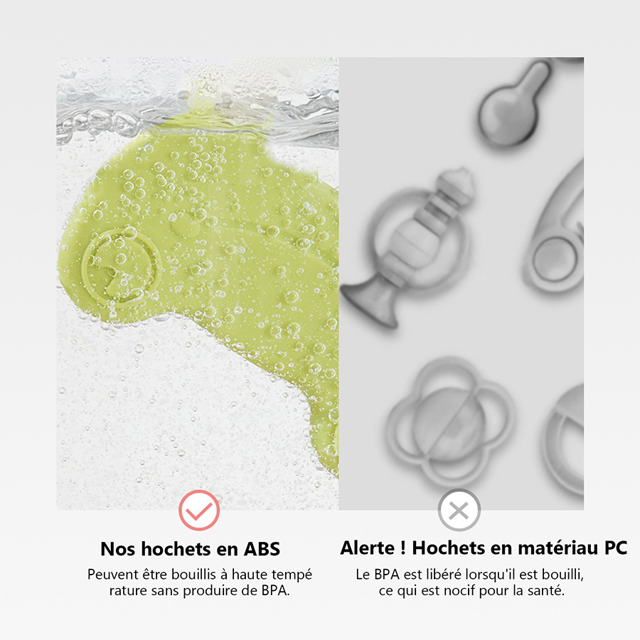 Facile à nettoyer Le jouet de hochet sont fabriqués à partir de matériau de sécurité ABS de qualité alimentaire et la tétine en silicone souple. Peut être bouillie à haute température et désinfection à la vapeur, et ne produit pas de BPA. Il y a des trous minuscules qui leur permet de sécher tout le chemin, pas facile de se reproduire les bactéries. Facile à nettoyer.