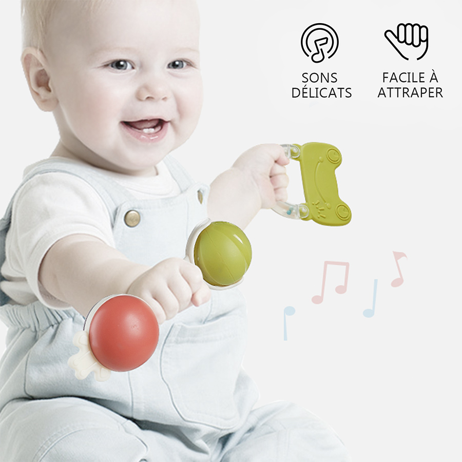 Jouets à usages multiplesChaque hochet est unique et amusant ! Le hochet est équipé de plusieurs poignées faciles à saisir, offrant de nombreux points de préhension pour le bébé. La taille scientifique est adaptée aux petites mains pour saisir et secouer, et exercer les mouvements de la main du bébé. Tout en étant secoué, le hochet émet un son agréable pour exercer l'ouïe de votre bébé. La conception de l'anneau de dentition en silicone souple soulage les démangeaisons de la dentition du bébé.