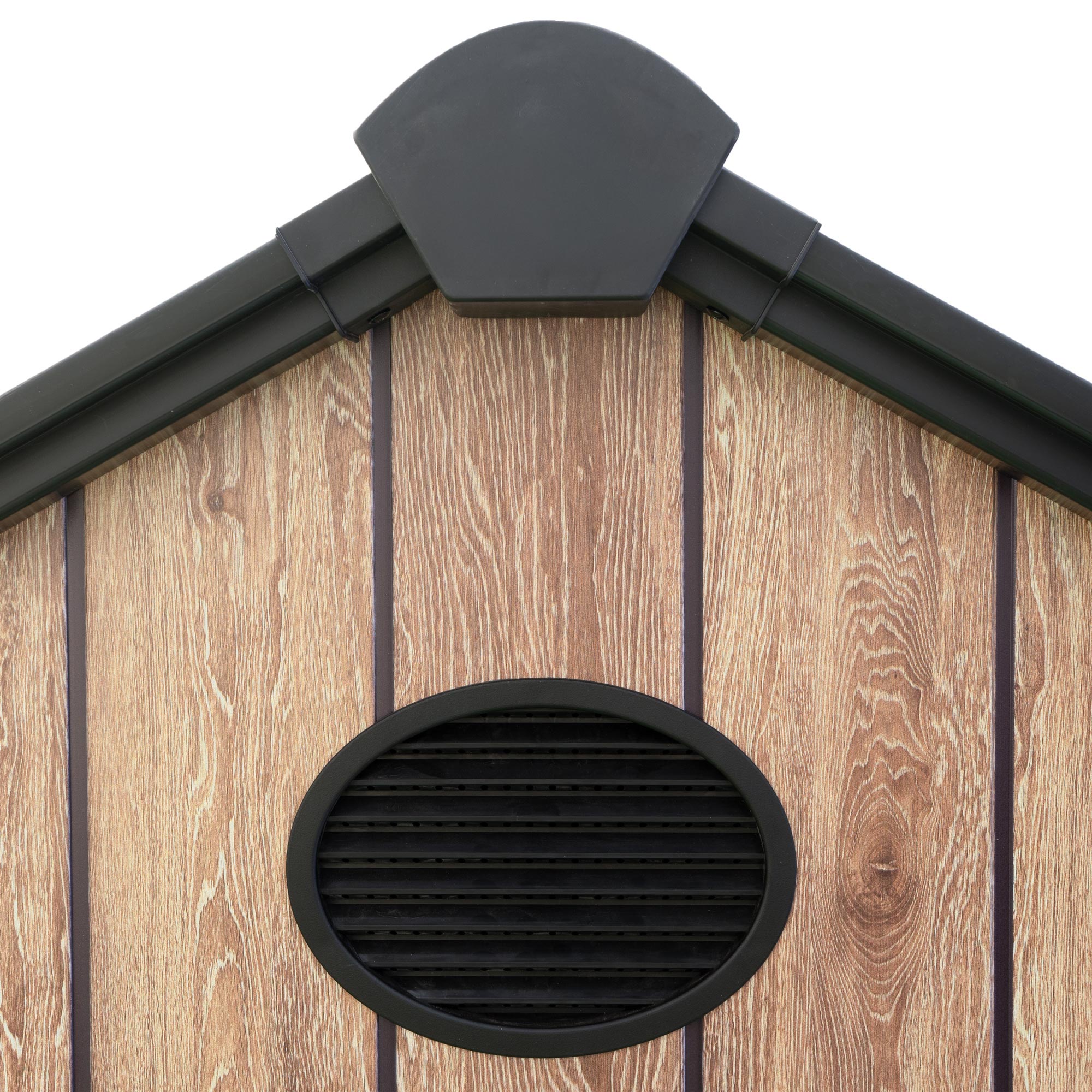 La finition effet bois apporte une esthétique chaleureuse et réaliste sans entretien : ne décolore pas, ne se déforme pas et conserve sa couleur face à l’exposition solaire et aux intempéries. Sa fenêtre latérale en polycarbonate solide laisse entrer la lumière naturelle, apportant luminosité et modernité au design, tandis que les aérations intégrées favorisent la ventilation et évitent la condensation. Pour plus de sécurité, elle dispose d’un verrou avec loquet et possibilité d’ajouter un cadenas, assurant la protection de vos objets à tout moment.