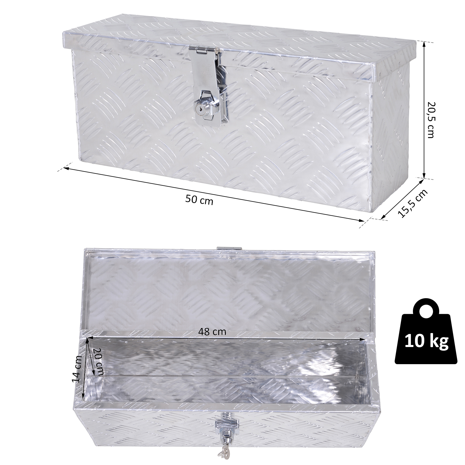 | Libellé | HOMCOM Boite de rangement - boîte à outils en aluminium - caisse à outil alu. verrouillage clé dim. 50L x 15,5l x 20,5H cm |