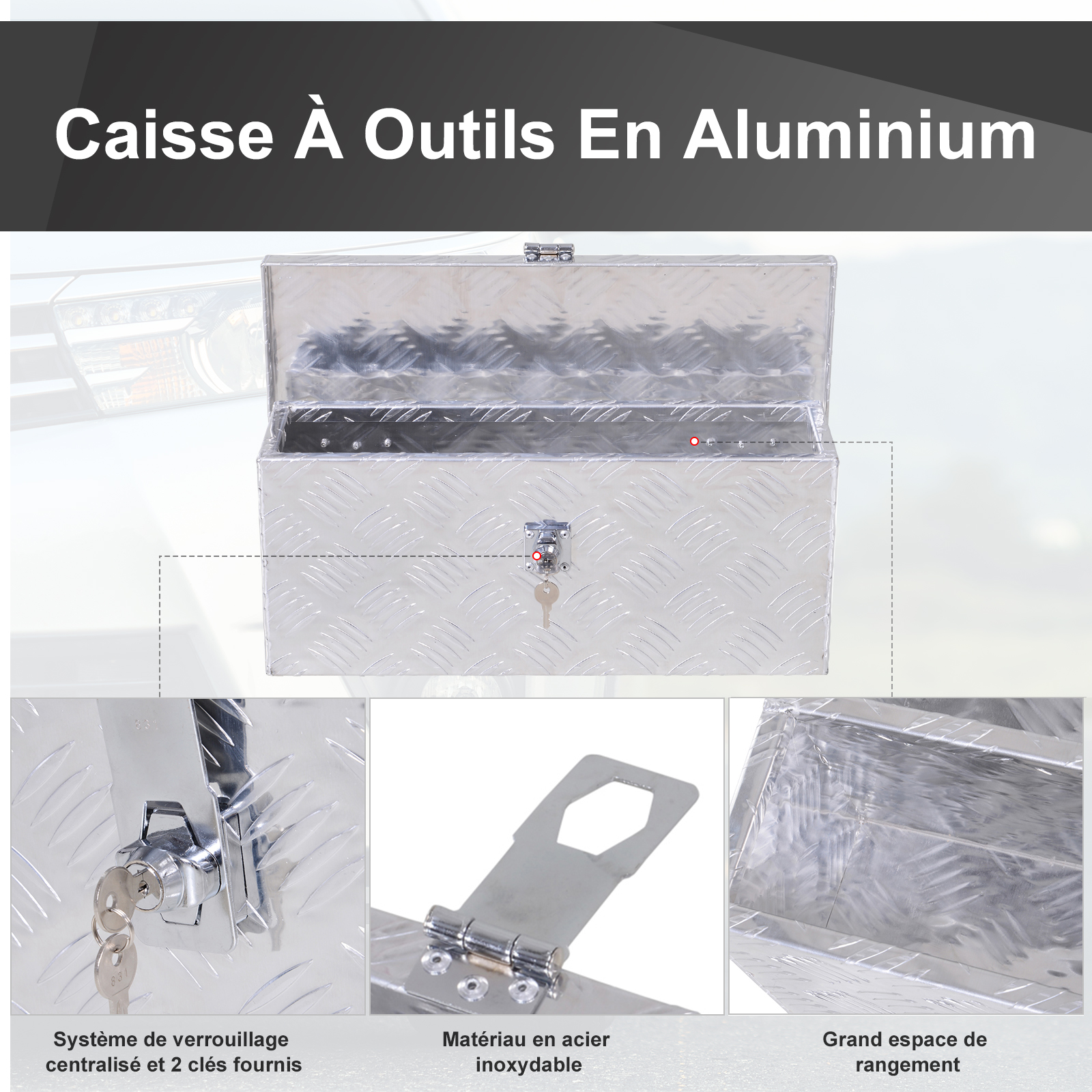 HOMCOM Boite de rangement - boîte à outils en aluminium - caisse à outil alu. verrouillage clé dim. 50L x