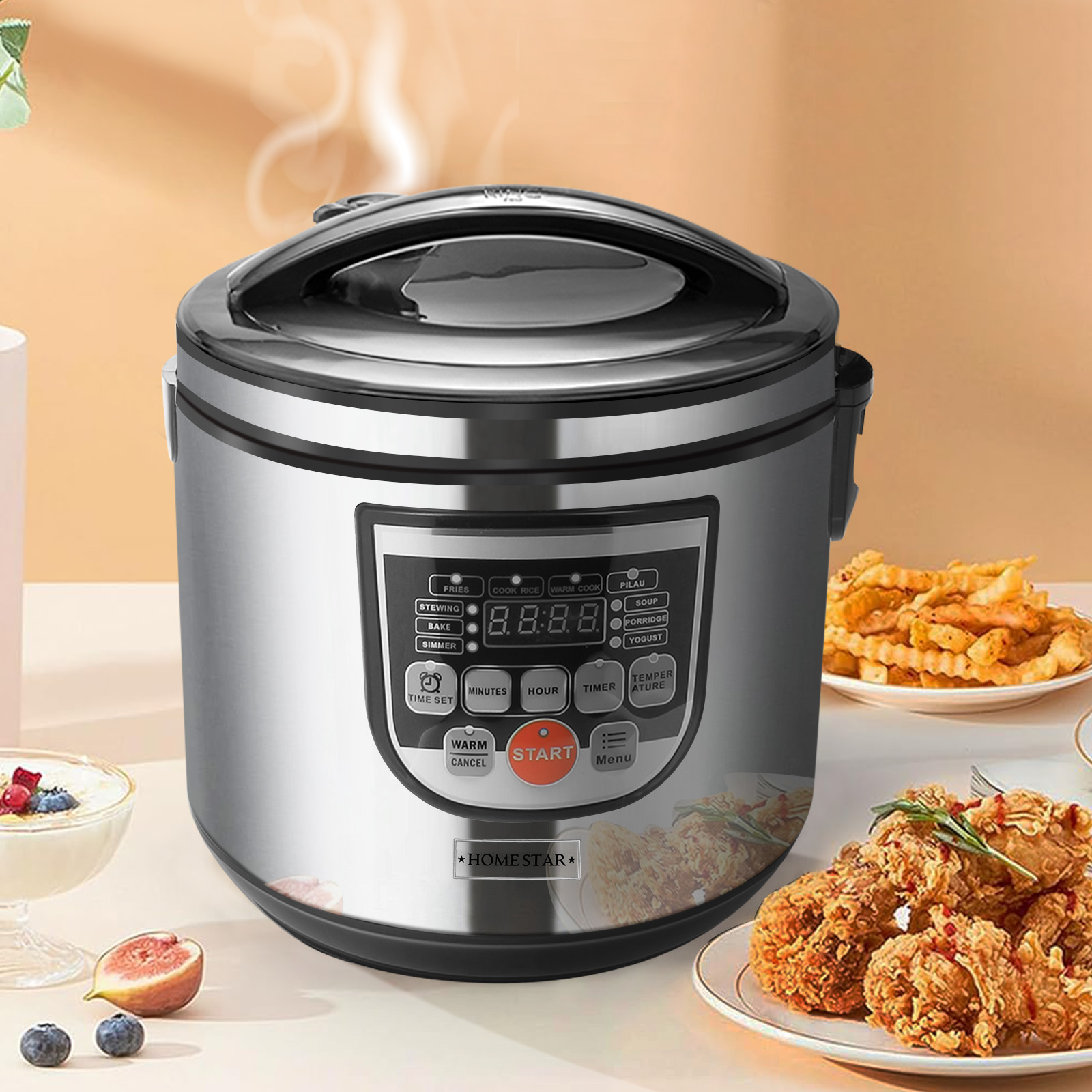 Le cuiseur à riz HOMESTAR 5L est conçu pour simplifier la cuisine familiale. Grâce à son grand bol antiadhésif, il prépare facilement riz, soupes, porridge ou même yaourts. Son écran digital intuitif vous permet de sélectionner vos modes de cuisson et d'utiliser la minuterie pour planifier vos repas. Avec sa fonction maintien au chaud automatique et son design inox élégant, il devient un indispensable du quotidien.