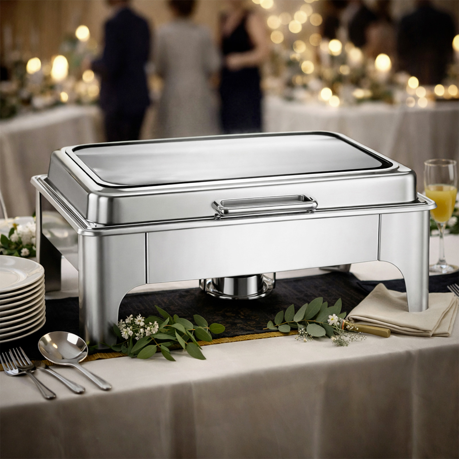 Ce chauffe-plats argenté rectangulaire 9L à simple compartiment en acier inoxydable intègre un bac inox amovible adapté aux préparations chaudes. La montée en température repose sur un réchaud à combustible placé sous la cuve pour conserver la chaleur de manière constante. Le couvercle rabattable avec vitre permet de contrôler visuellement le contenu sans soulever entièrement le capot.