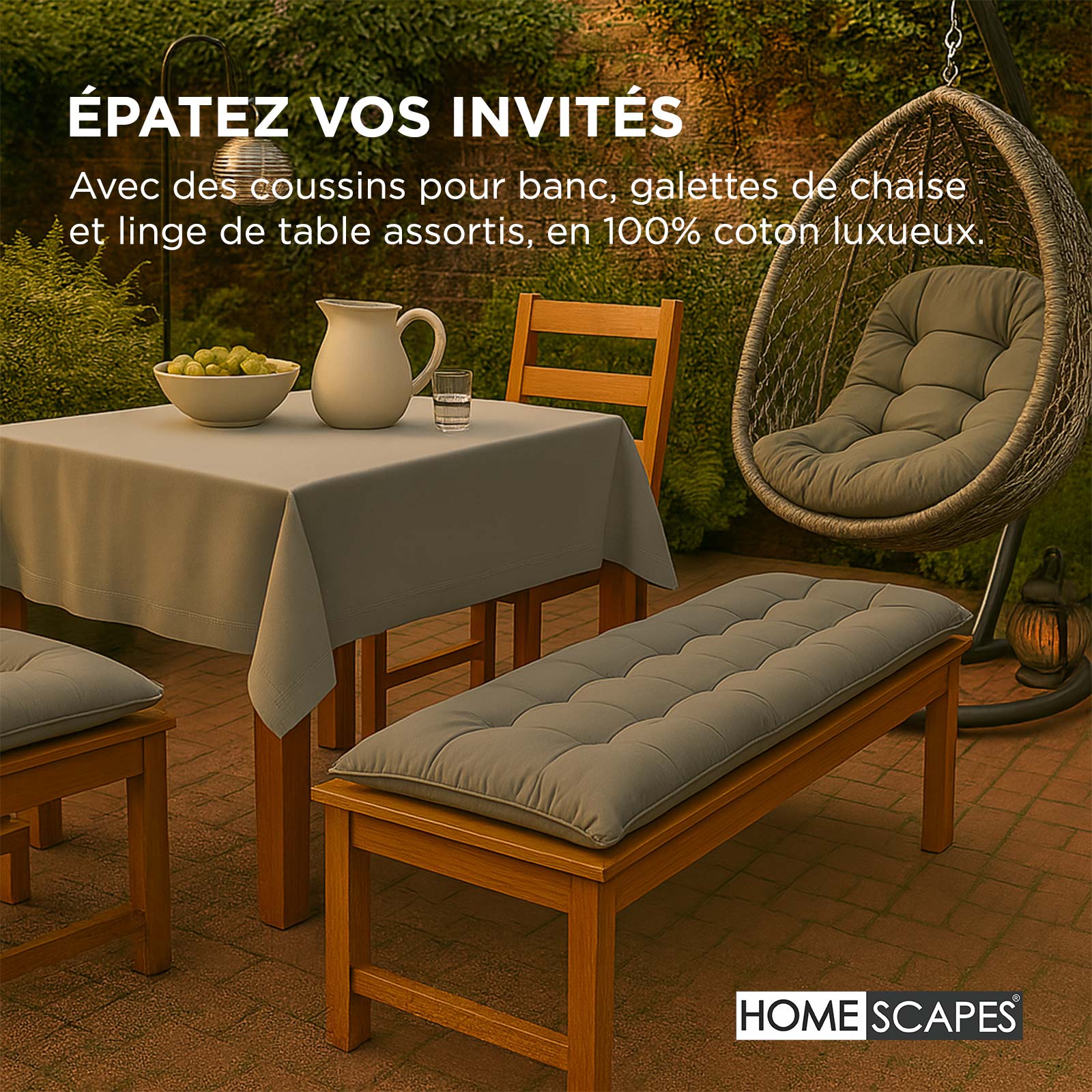 Apportez une touche de confort et de style à votre fauteuil œuf suspendu avec ce coussin d’extérieur en coton, conçu pour s’adapter parfaitement à la forme enveloppante de votre chaise suspendue. Fabriqué en tissu coton doux et résistant, il possède un garnissage généreux de 2000g de polyester luxueux, offrant un confort moelleux, durable et idéal pour vos instants de détente en extérieur. Pratique et facile à vivre, ce coussin pour fauteuil suspendu est lavable en machine, ce qui le rend parfait pour un usage quotidien sans contrainte. Disponible en cinq coloris tendance, il s’harmonise facilement à votre mobilier de jardin comme à votre décoration intérieure, apportant une note chaleureuse et élégante à vos espaces de vie. Associez-le aux galettes de chaise et coussins pour banc de jardin assortis afin de créer une ambiance extérieure coordonnée et chaleureuse. Avec son rembourrage généreux et sa forme ergonomique, ce coussin pour fauteuil œuf suspendu offre un confort optimal pour vos moments de relaxation. Attention : ce coussin n’est pas imperméable ni déperlant. Nous vous conseillons donc de le ranger à l’abri de l’humidité et si possible en intérieur après usage.
