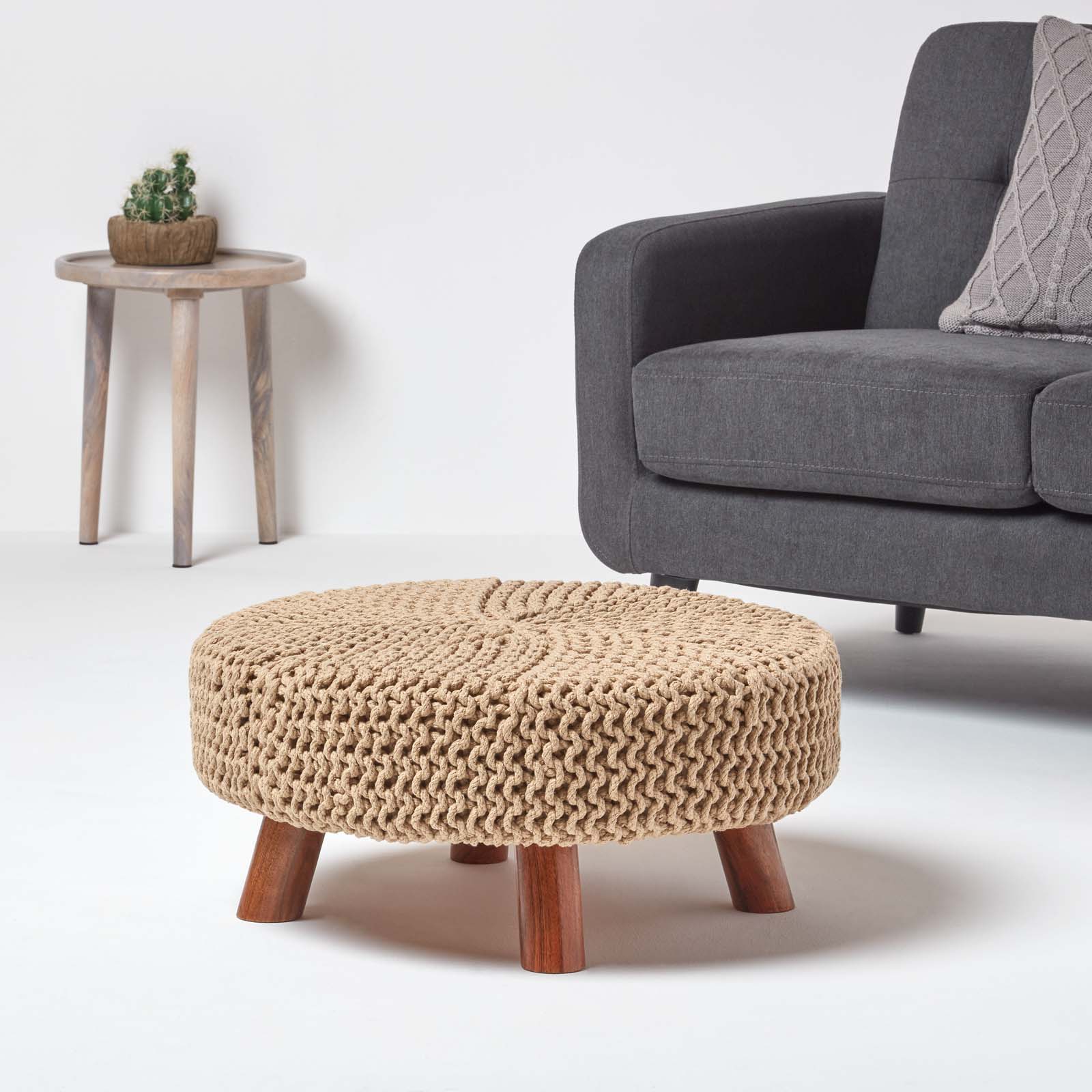 Homescapes Grand Pouf tressé en tricot et pieds en bois - Beige