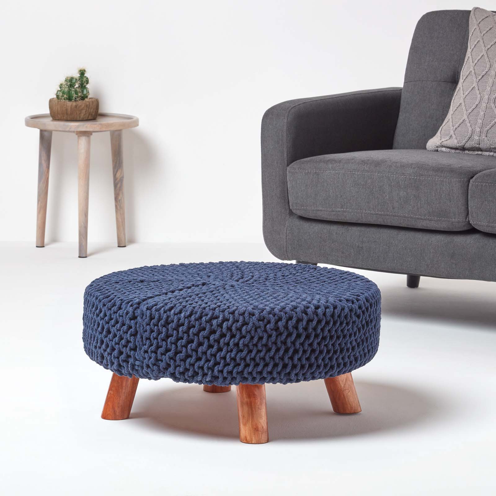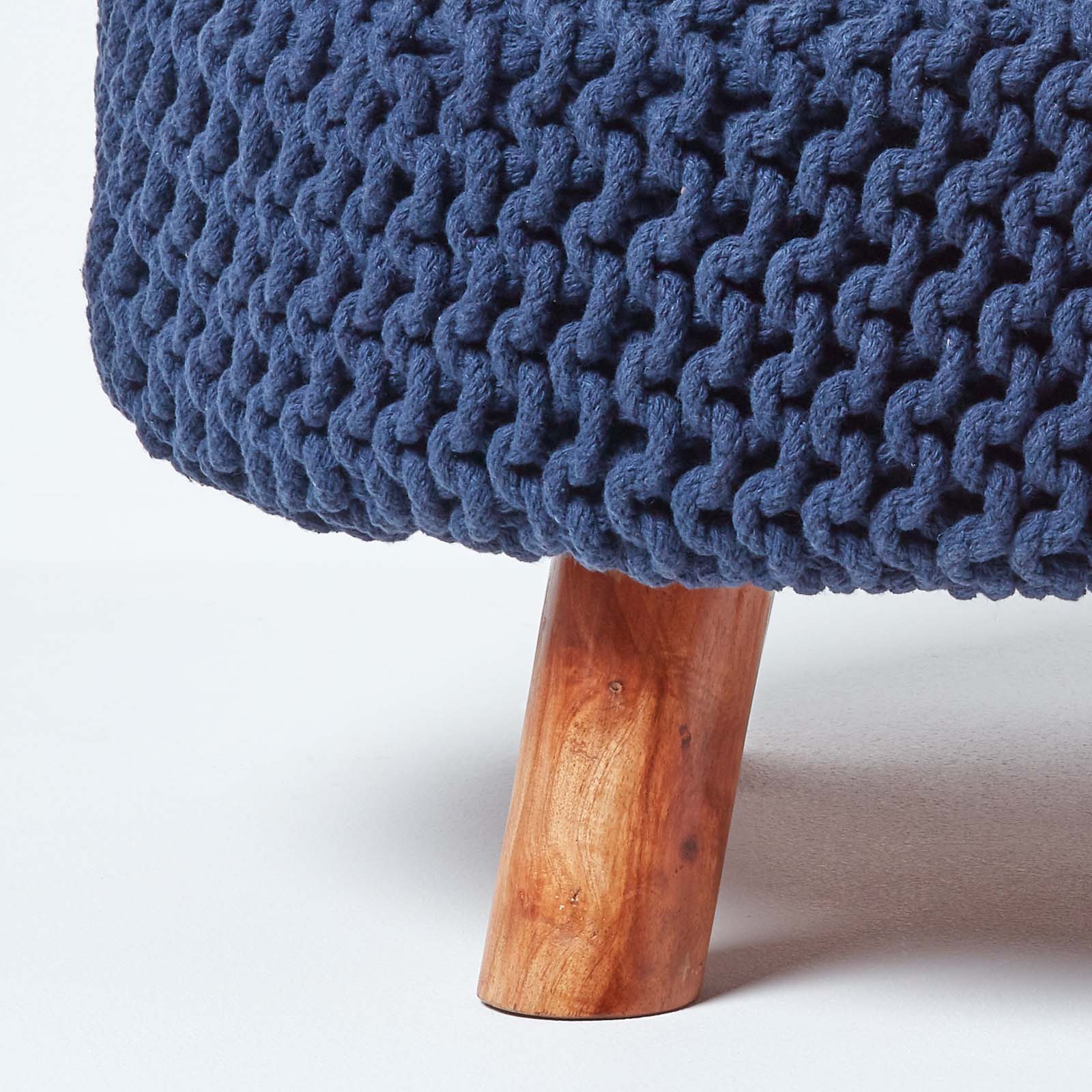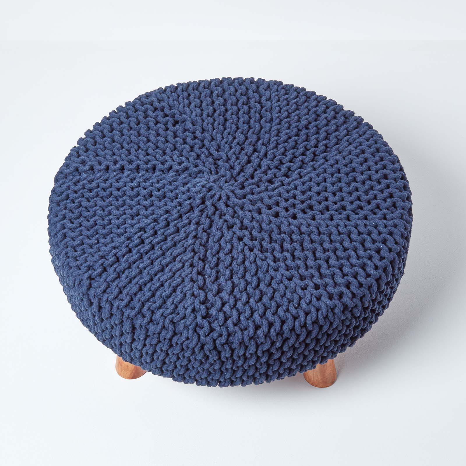 Homescapes Grand Pouf tressé en tricot et pieds en bois - Bleu Marine