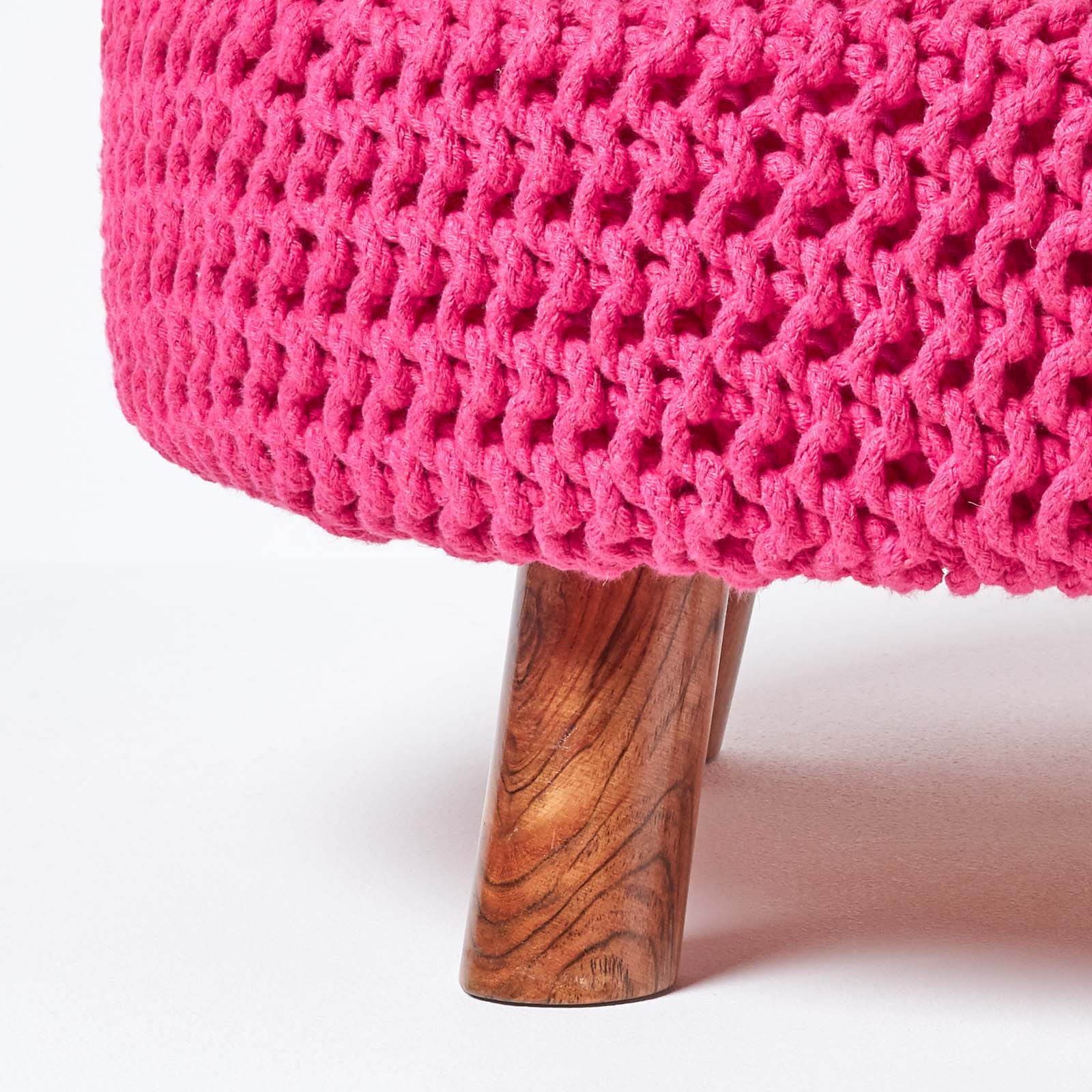 Homescapes Grand Pouf tressé en tricot et pieds en bois - Rose fuchsia