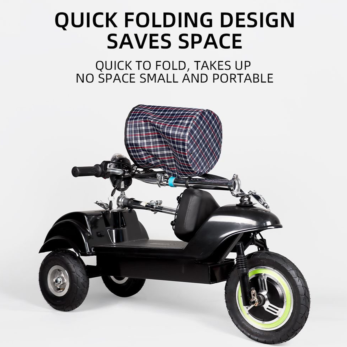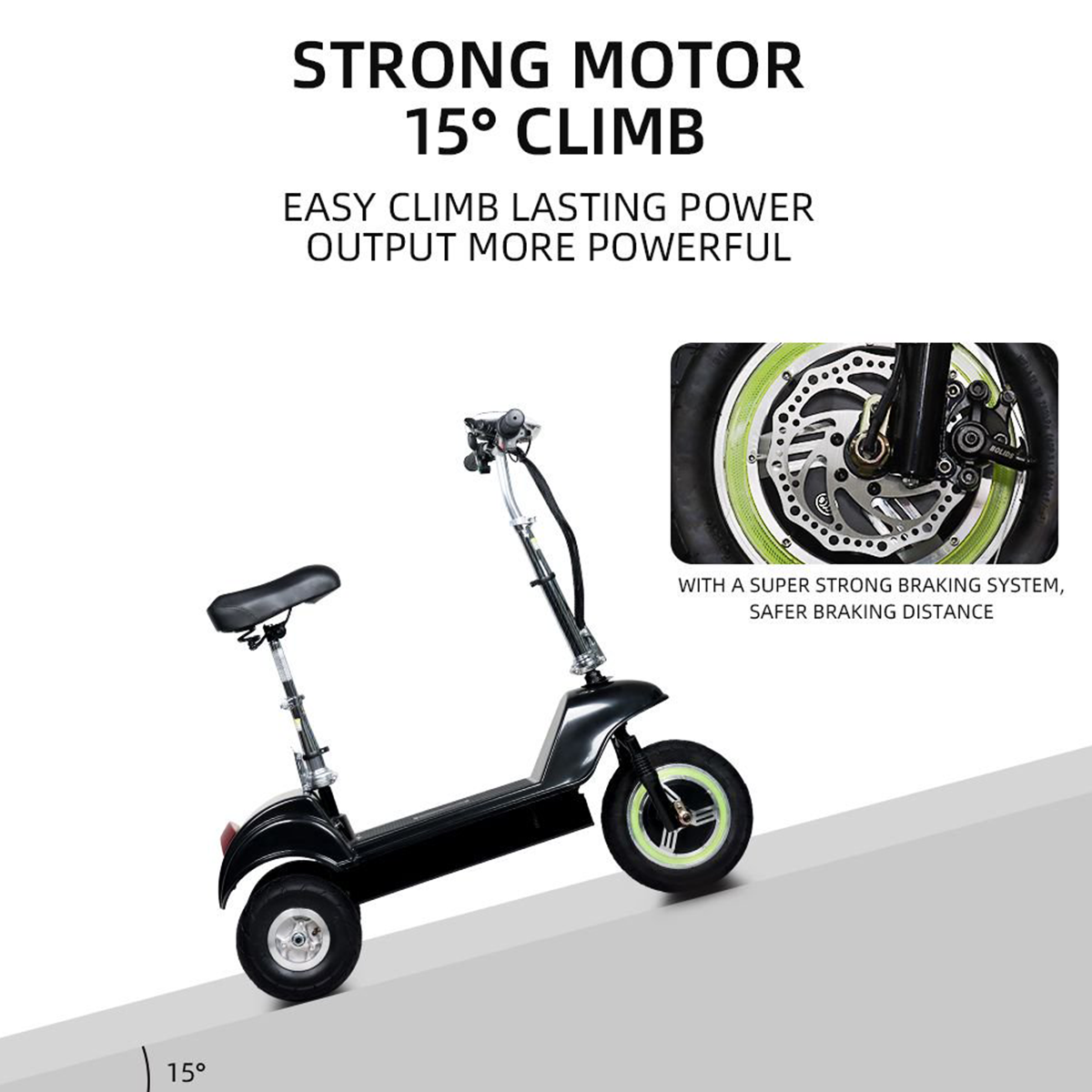 La conception à trois roues offre une structure stable, réduisant le risque de basculement, tandis que les freins à disque offrent une puissance de freinage efficace et fiable avec une distance de freinage de 5 à 7 mètres pour plus de sécurité.