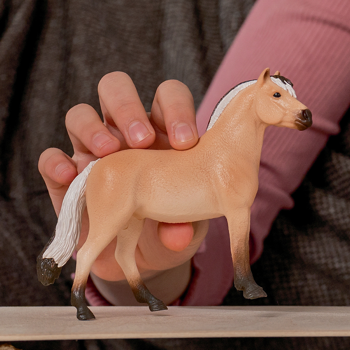 D’un regard éveillé, le hongre Fjord observe le monde qui l’entoure. Ses petites oreilles se dressent avec attention. Aurait-il des visiteurs ? D’un air pensif, il penche la tête sur le côté... Non, ce n’était que le bruissement du vent dans les feuilles. Dommage, car le hongre Frison (reconnaissable à sa raie de mulet et à sa crinière bicolore) aime avoir de la compagnie. C’est peut-être l’occasion d’aller rendre visite à la jument Fjord (disponible séparément).