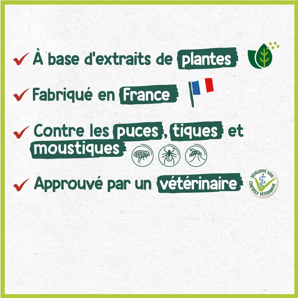 Passer le carrousel d'images⚕️【PRESERVEZ LEUR SANTE】Le collier Insectifuge HOPI agit en repoussant les parasites. Idéal pour repousser les puces, les tiques et les moustiques. Adapté aux chiens de plus de 20 kg. Facile à mettre en place : Fixer le collier autour du cou de l'animal en passant l'extrémité de la lanière dans la boucle. Ne pas serrer le collier (laisser un espace de 2 doigts entre le collier et le cou de l'animal). Couper l'excédent à 2 cm après la boucle (laisser un peu plus pour les animaux en croissance). 🌱【NATUREL ET PRATIQUE】 Le collier Insectifuge HOPI est formulé à base d'extrait de plantes de Margousier, d'extrait de Lavandin et de Géraniol. Actif dès sa mise en place, il agit en repoussant les parasites jusqu'à 4 mois, selon la saison. Pour augmenter son efficacité, utilisez-le en début de saison. Protection idéale antipuces/antitiques chien. Evite la contamination de son panier chien. ❤️【SANS RISQUE POUR EUX】Fabriqué en France, ce collier est sans colorant, sans PVC et sans phtalate pour assurer la sécurité de votre animal. Il est également résistant à l’eau. Développé sous contrôle vétérinaire. Longueur de collier : 75 cm. Utilisez les biocides avec précautions. Avant toute utilisation, lisez l'étiquette et les informations concernant le produit. 💎【CHOISISSEZ UNE MARQUE RESPONSABLE ET DURABLE】La marque complice de tous les instants de vie des animaux, qui avance pour la planète, pas à pattes. Guidée par des valeurs de partage, de transparence et de générosité, nous concevons des produits sains, efficaces, adaptés aux besoins physiologiques des animaux, en alliant qualité, originalité et éco-responsabilité. Chaque jour notre mission est d’accompagner les animaux de compagnie à chaque instant de leur vie tout en préservant la planète. 🇫🇷【SOUTENEZ UNE CONSOMMATION PLUS RESPONSABLE】Forte de ces 70 années d’existences, notre société familiale Française est labellisée PME+. Un label qui atteste d'un engagement fort pour l'humain, l'emploi et l'environnement. En tant que consommateur, avec ce label, vous avez la garantie de consommer de façon plus responsable pour votre animal. Choisir des produits de qualité avec un savoir-faire reconnu. Soutenir les efforts d’une entreprise engagée dans une démarche d’amélioration continue.