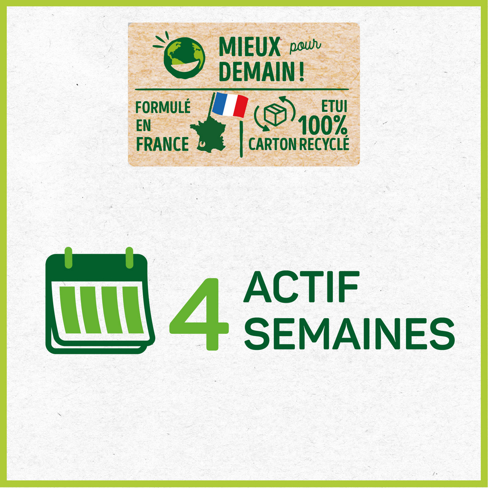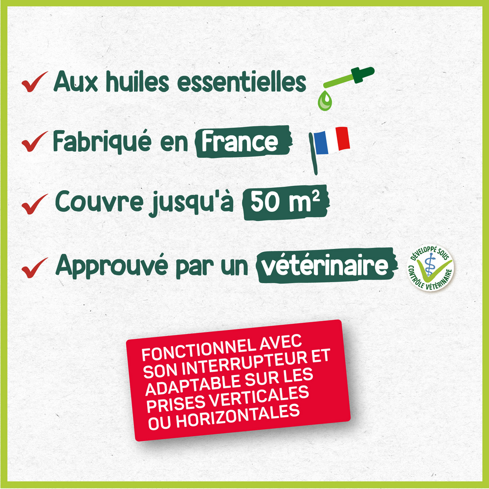 | Plus produit | Reste actif environ 4 semaines. Diffuseur et sa recharge à base de plantes naturelles. Formulé et conditionné en France. |