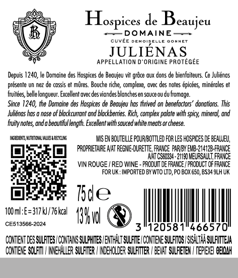 | Libellé | Hospices de beaujeu, 2024 - Juliénas AOP - Rouge - 75 cl |