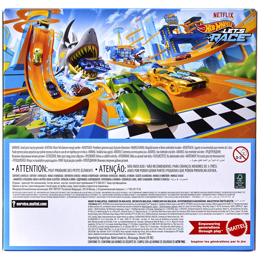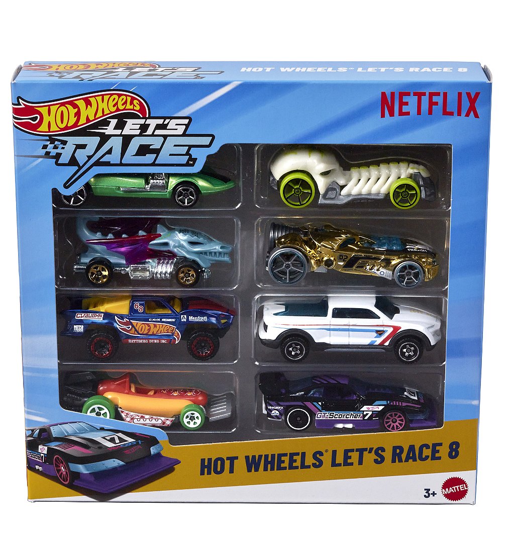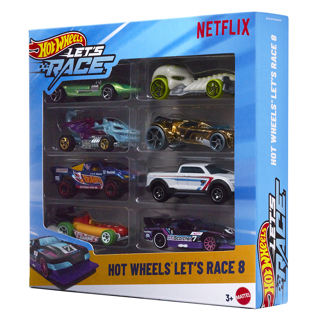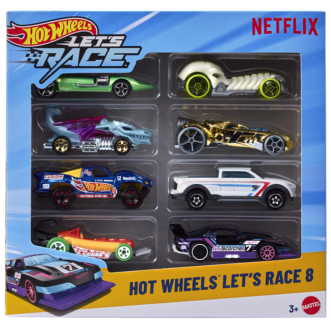 Lancez-vous dans une course et réalisez des cascades comme les héros Hot Wheels de « Let’s Race » avec un coffret de 8 voitures et camions en vedette dans la série Netflix. Ce coffret de 8 véhicules comprend une variété de véhicules à l’échelle 1/64, tels que Street Wiener, GT-Scorcher et Baja Truck, pilotés par Coop, Sparks, Axle et le gang pour de grands pilotes de Hot Wheels. Recréez vos scènes préférées de la série ou imaginez de nouvelles histoires ! Les couleurs, les modèles et les décorations peuvent varier.