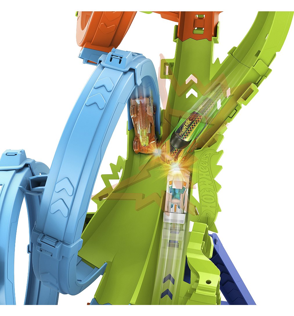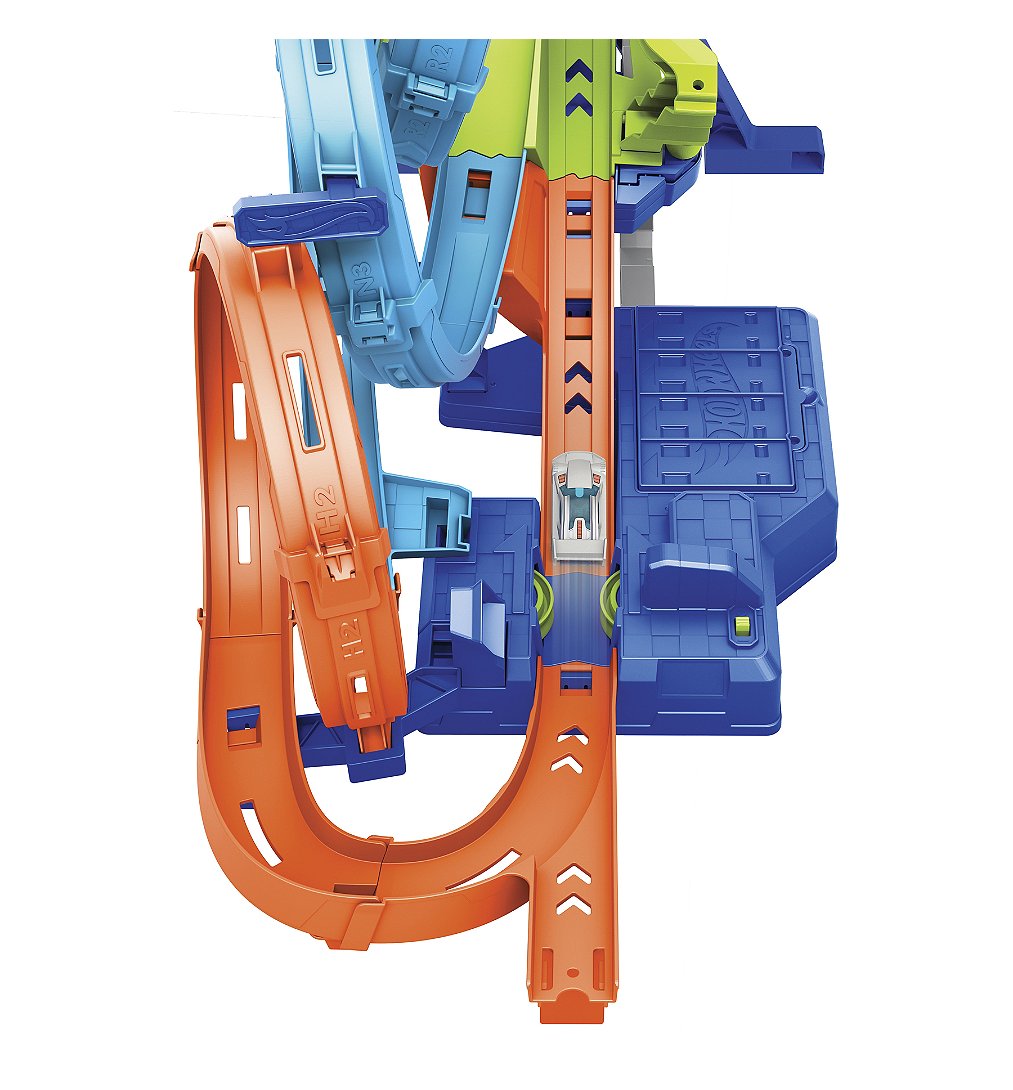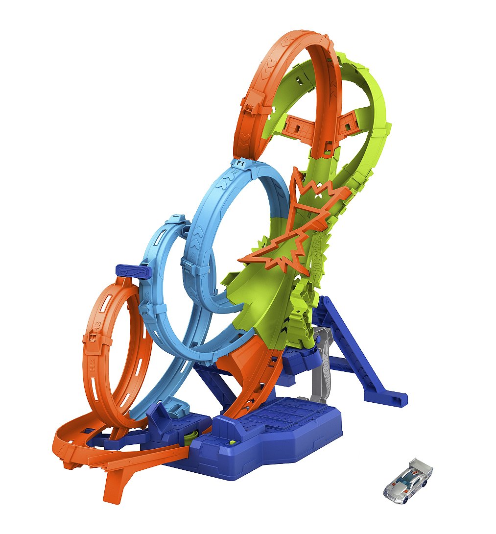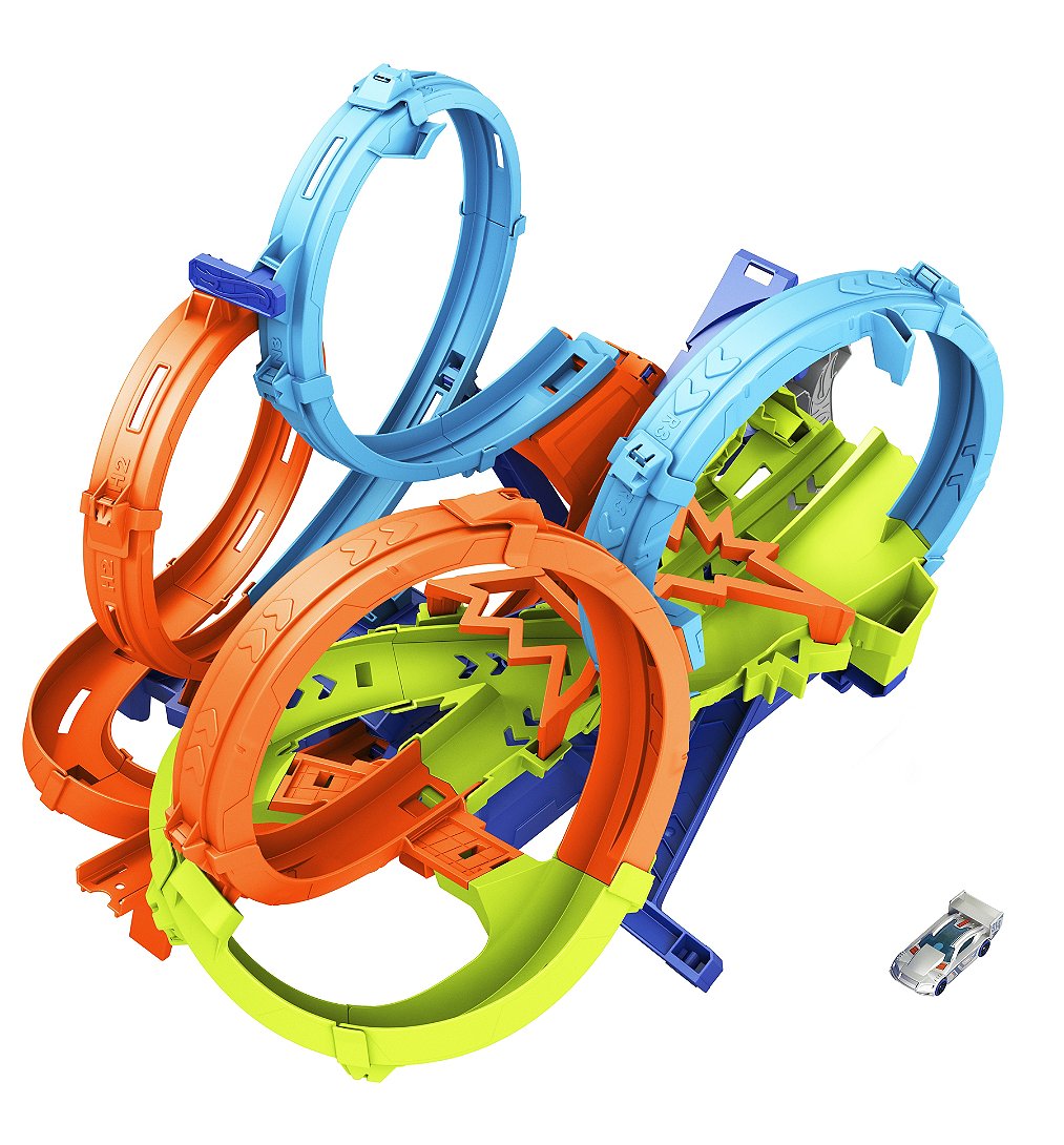 Playset de 68.5cm de haut ! Repliable et motorisé avec 4 loopings, une courbe inclinée et 3 zones de crash, 4 places de parking et 1 voiture incluse.
