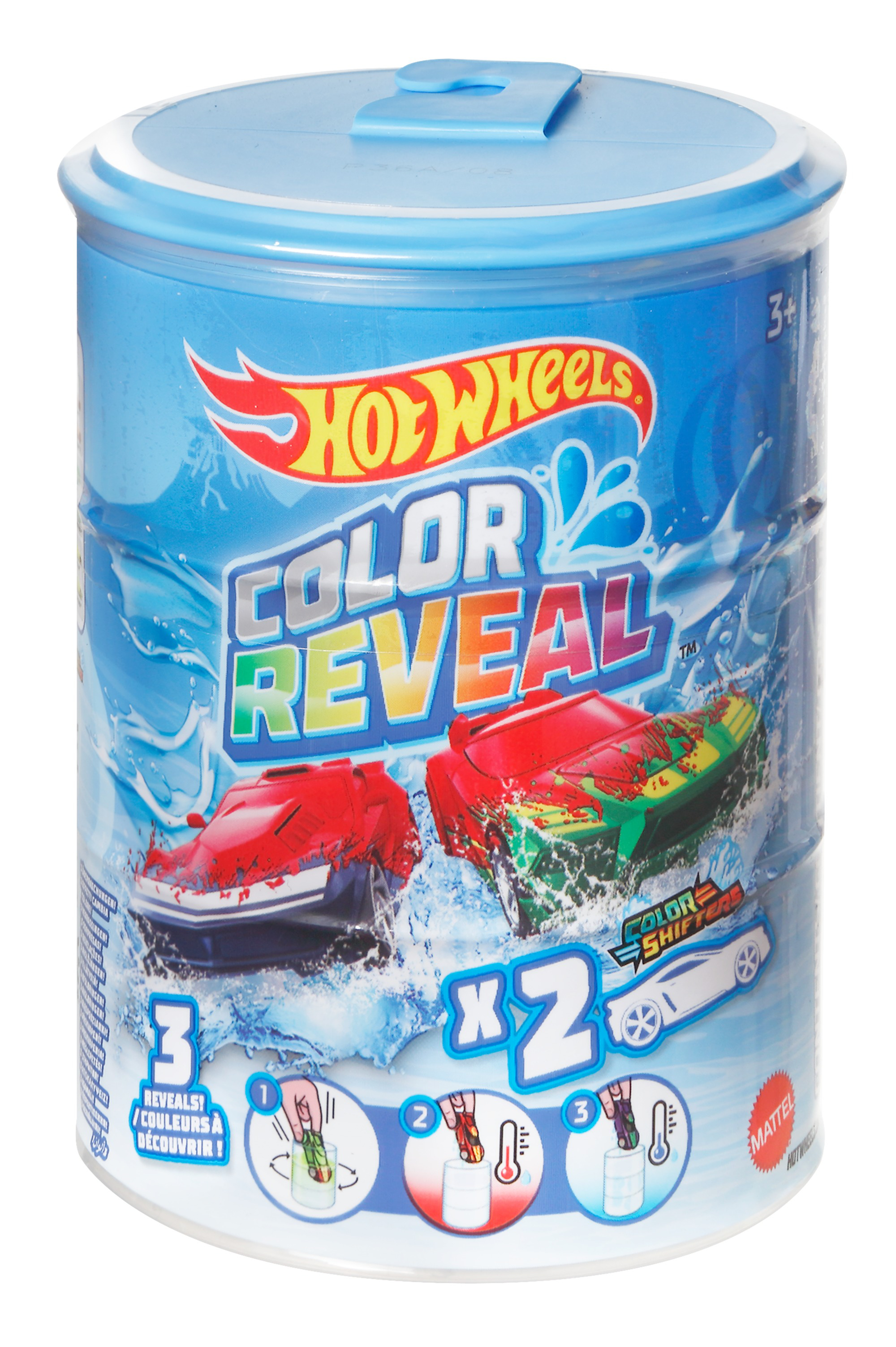 Dans le tube, 2 voitures Hot Wheels Color Reveal 1/64è recouvertes d’un revêtement spécial Color Reveal. Changez la couleur des véhicules une 1ère fois : remplissez le fût d’eau et faites-y tourner chaque véhicule jusqu’à ce que l’eau change de couleur. Sortez votre véhicule : les décorations de la carrosserie apparaissent ! Pour modifier à nouveau le décor des véhicules, recommencez avec de l'eau froide. Répétez cette opération à volonté ! Chacun vendu séparément, modèle aléatoire, dès 3 ans