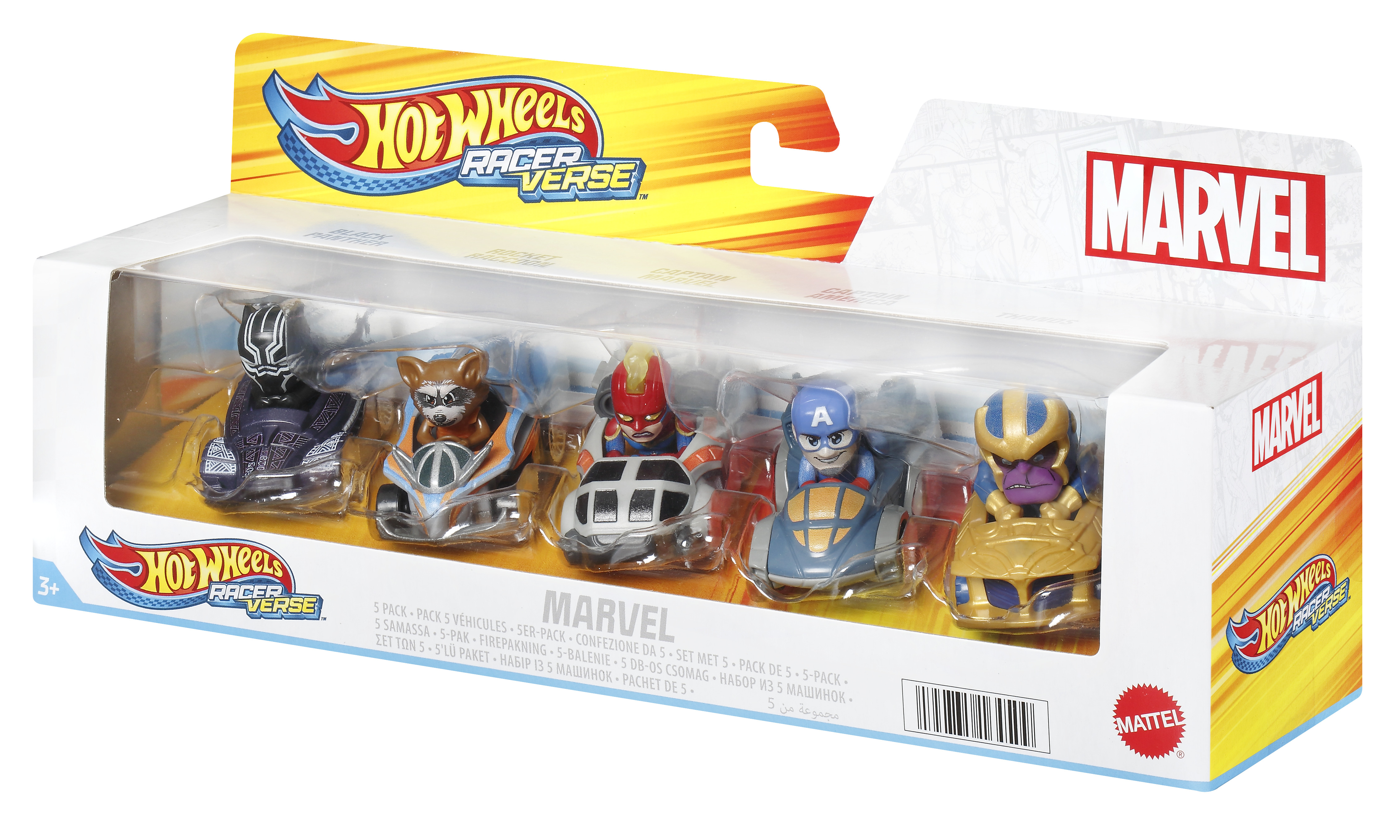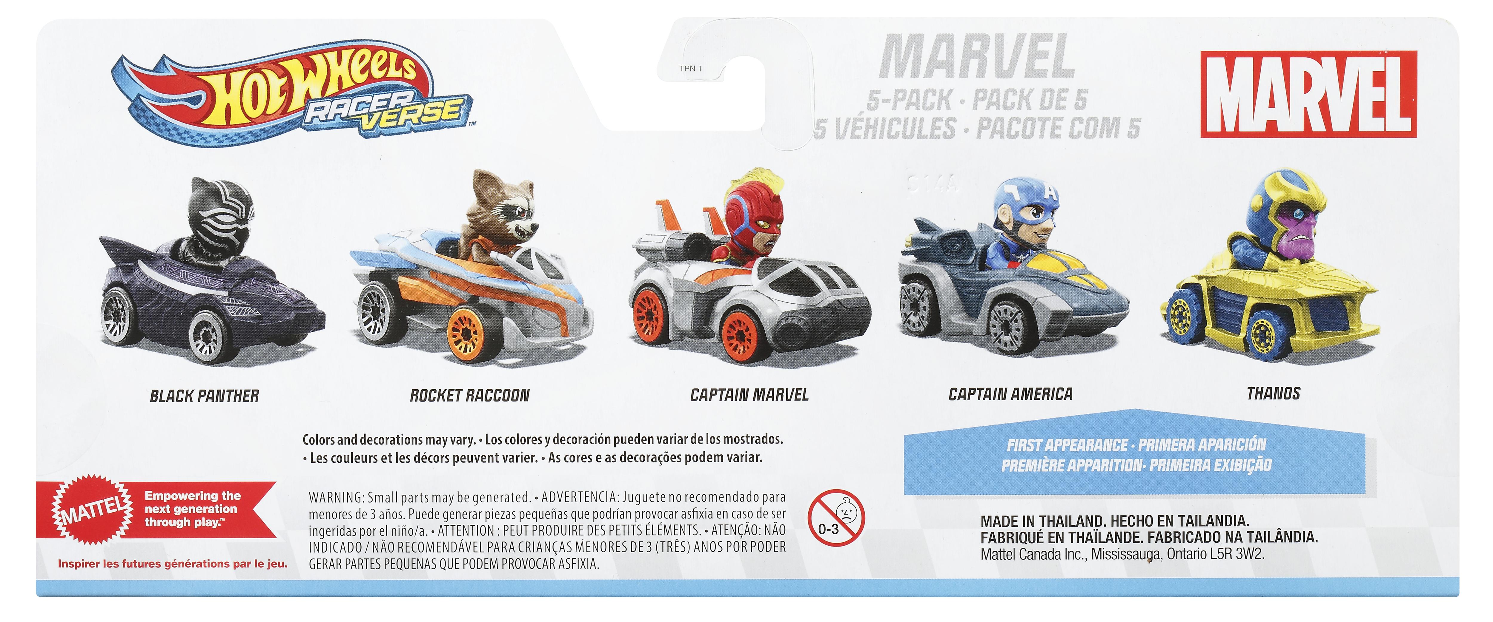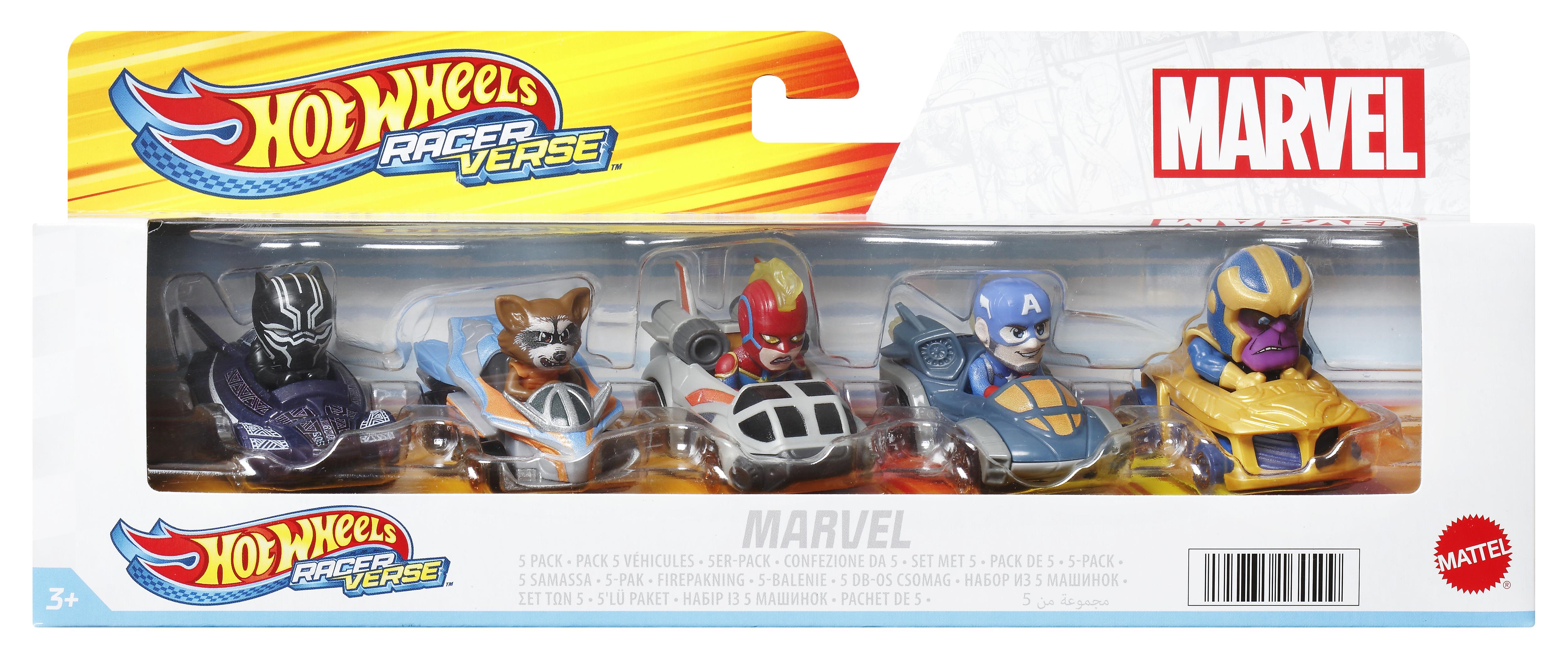La boîte contient Inclut 5 véhicules en métal Marvel Hot Wheels RacerVerse avec figurines non amovibles.