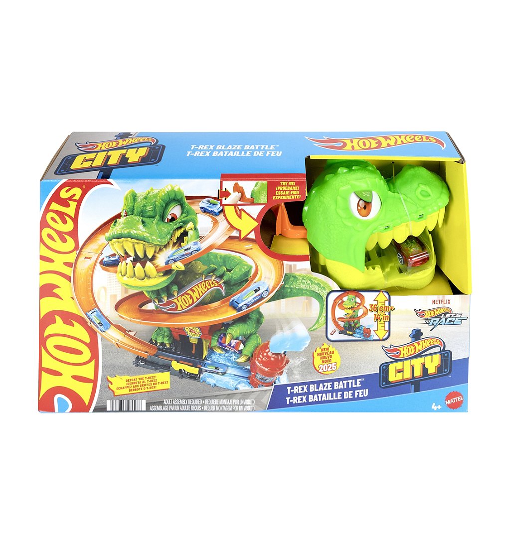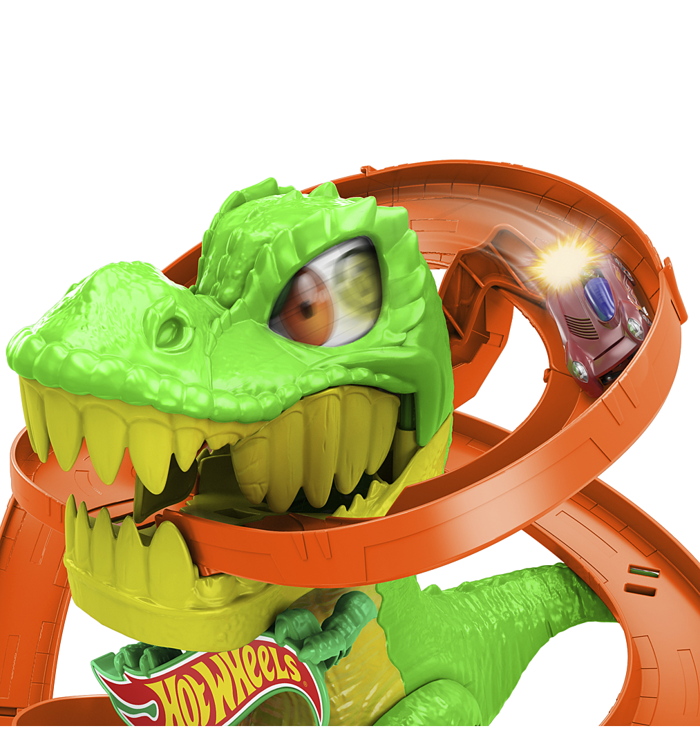 Déployez tous vos talents de pilote pour protéger Hot Wheels City d’un T-Rex impressionnant, bien décidé à croquer toutes les voitures ! En lançant le véhicule en métal à l’échelle 1/64 (inclus dans le coffret), les enfants lui font faire le tour du dinosaure avec trois possibilités : se faire manger, faire un détour pour un plein de carburant ou vaincre la créature et sauver ses amis. Chaque fois qu’une voiture passe en trombe devant lui, les yeux du T-Rex tournoient et ses bras s’agitent jusqu’à ce qu’il soit mis hors d’état de nuire ! Un espace de rangement pour d’autres voitures est prévu, ainsi que d’autres détails à actionner, pour inventer encore plus d’histoires incroyables. Les couleurs et les décorations peuvent varier.