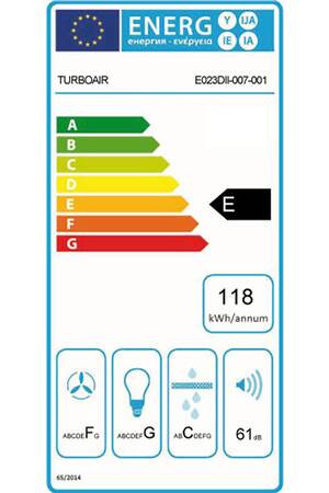 Turboair 8020283032569. Puissance d'extraction maximum: 368 m³/h, Type d'extraction: Conduit / Recirculation, Niveau sonore: 62 dB. Type: Monté au mur, Couleur du produit: Acier inoxydable, Transparent, Matériau du boîtier/corps: Verre, Acier inoxydable. Puissance de l'ampoule: 20 W, Nombre d'ampoules: 2 ampoule(s), Type d'ampoule: Halogène. Classe d'efficacité énergétique: E, Charge connectée: 175 W. Largeur: 600 mm, Profondeur: 450 mm, Hauteur (min): 60 cm