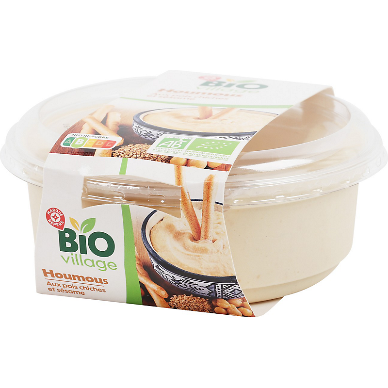Ingrédients : Pois chiches cuits* 57 % (pois chiches*, eau) ; huile de tournesol* ; eau ; pâte de graines de sésame* 6,8 % ; huile d'olive vierge extra* ; jus de citron* ; acidifiants : acide lactique, acide citrique ; sel ; ail déshydraté*.