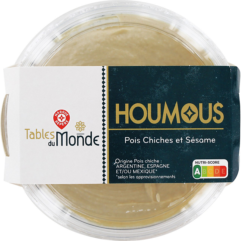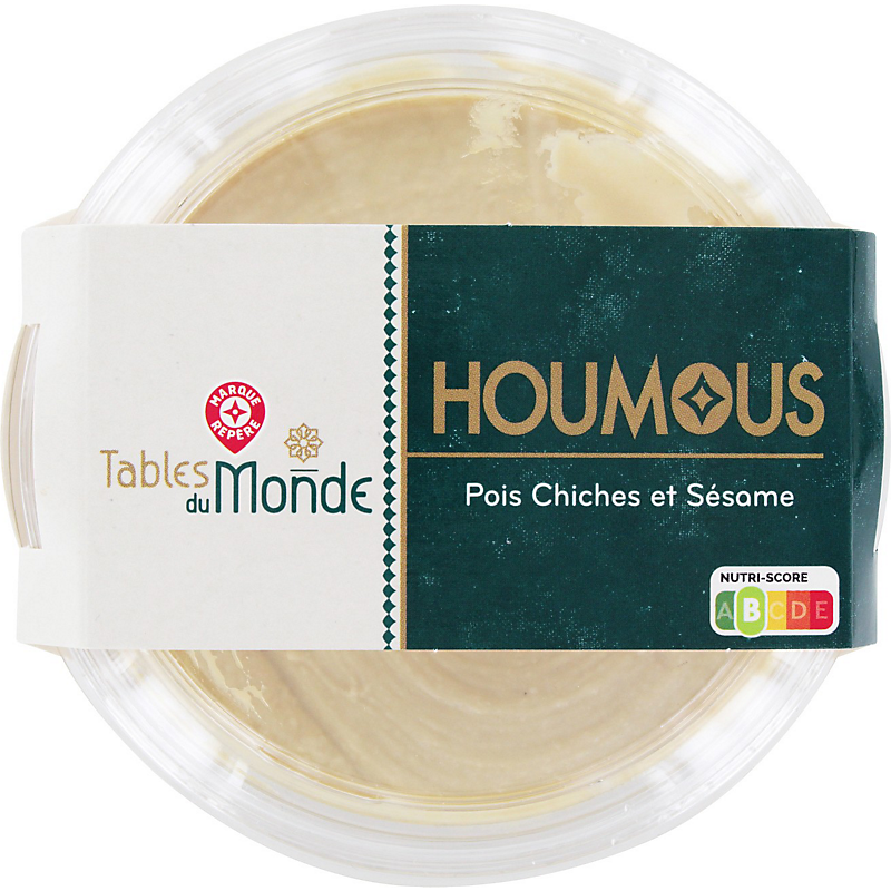Ingrédients : Pois chiches cuits 53,1 % ( pois chiches, eau) ; huile de tournesol ; eau ; pâte de graines de sésame 6,1 % ; huile d'olive ; jus de citron concentré ; jus de citron ; sel ; conservateur : E202 ; vinaigre en poudre ; arômes ; extrait de romarin ; ail en poudre.