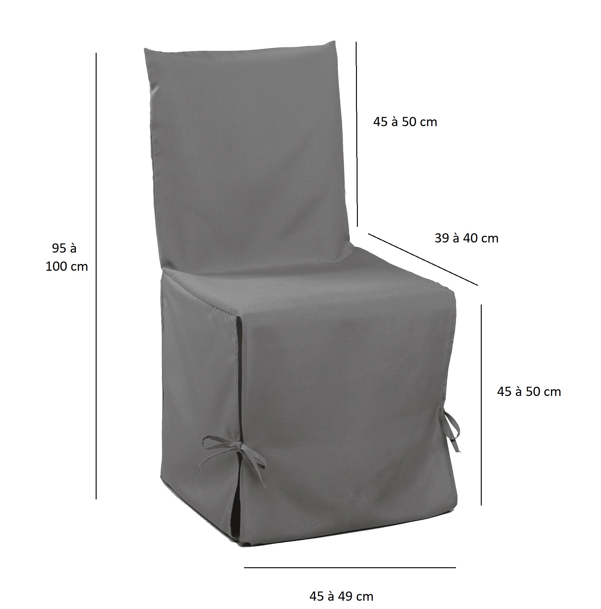 Housse de chaise Dimensions : Largeur Assise : (+ou-) L. 49 cm Longueur Assise: (+ou-) L. 40 cm Hauteur Assise : (+ou-) H. 45 à 50 cm Hauteur Dossier : (+ou-) H. 45 à 50 cm Hauteur Totale : (+ou-) H. 95 à 100 cm Non extensible il faut mesurer vos chaises afin d'avoir la bonne taille exacte Matière : polyester Finition : nouettes Conseils d'entretien : Lavage à 30° - Pas de séchage en machine - Repassage à 110° Completez votre interieur avec dans la même collection nappes, rideaux, galettes de chaise.