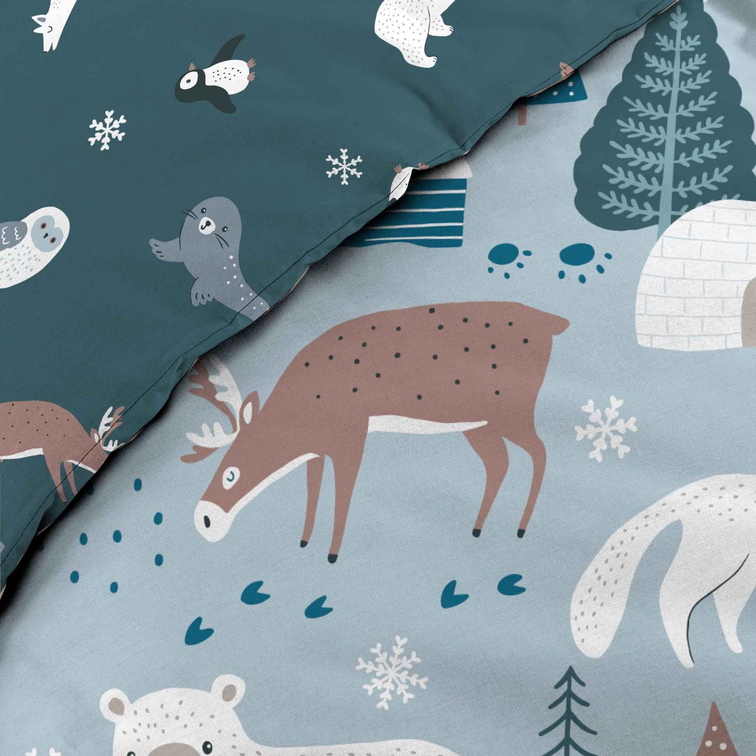 Vous allez adorer cette parure de lit enfant pour une chambre sur le thème des animaux avec cette housse de couette imprimée ours, pingouin, morse, rennes, sapin, igloo, neige...