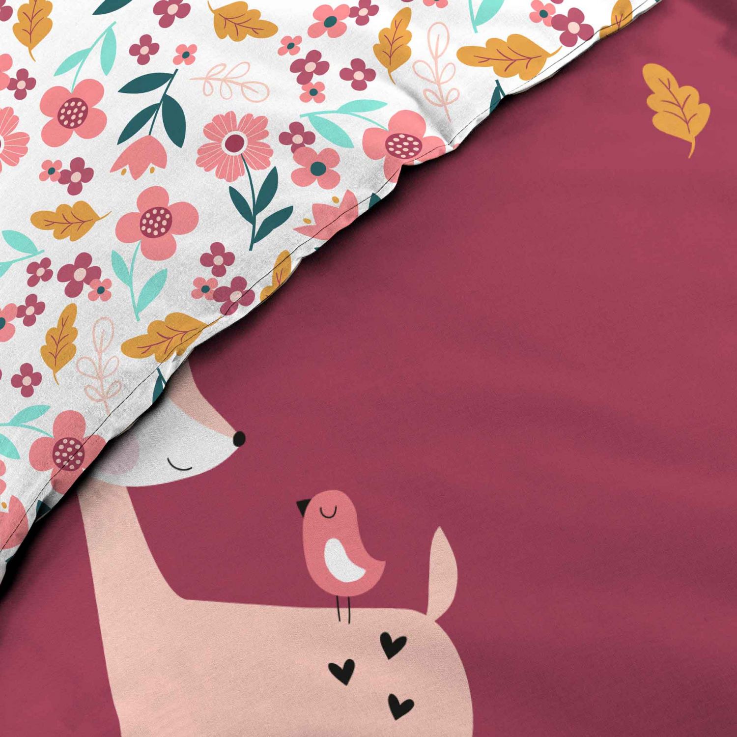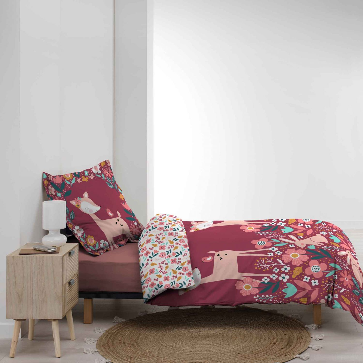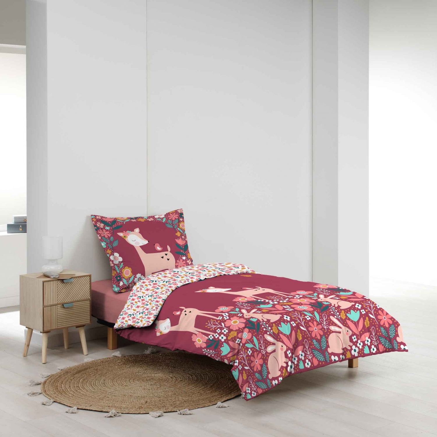 Vous allez adorer cette parure de lit enfant pour une chambre de fille sur le thème des animaux avec cette housse de couette imprimée biche, lapin et fleur.