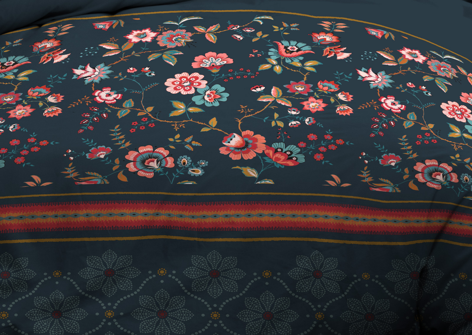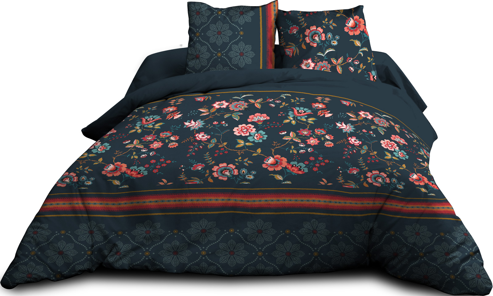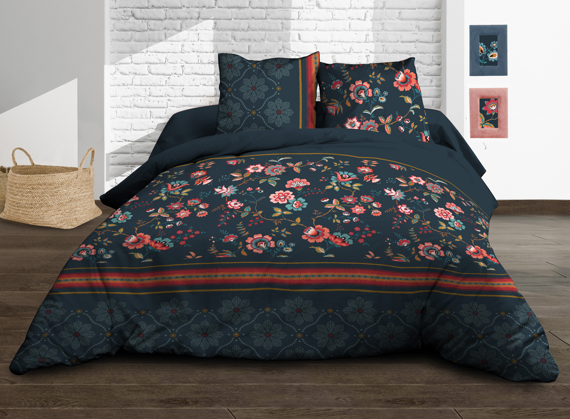 Ensemble pour lit 2 personnes Pur coton imprimé, tissage serré (57 fils/cm2) - Composé d'une housse de couette 220x240 cm et de 2 taies d'oreiller 63 x 63 cm - Fermeture par boutons pression - 100% coton Label OekoTex - Lavage en machine à 30°